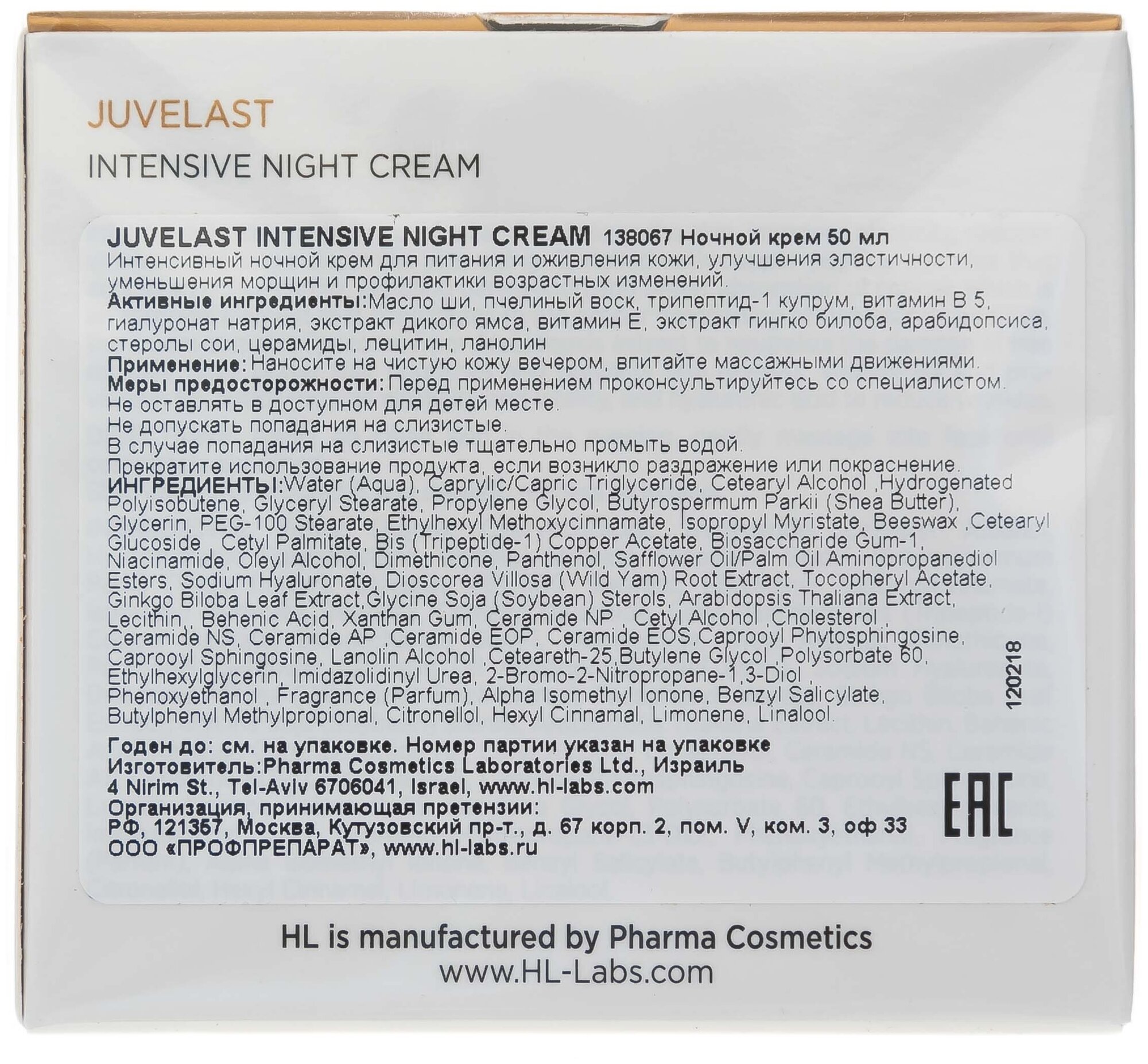 Ночной крем Juvelast Intensive Night Cream разработан для ухода за зрелой кожей лица. Входящие в состав высокоактивные компоненты интенсивно питают и увлажняют. Крем улучшает эластичность, разглаживает морщины и профилактирует появление новых во время сна. После применения кожа выглядит оживленной, тон лица улучшается.
