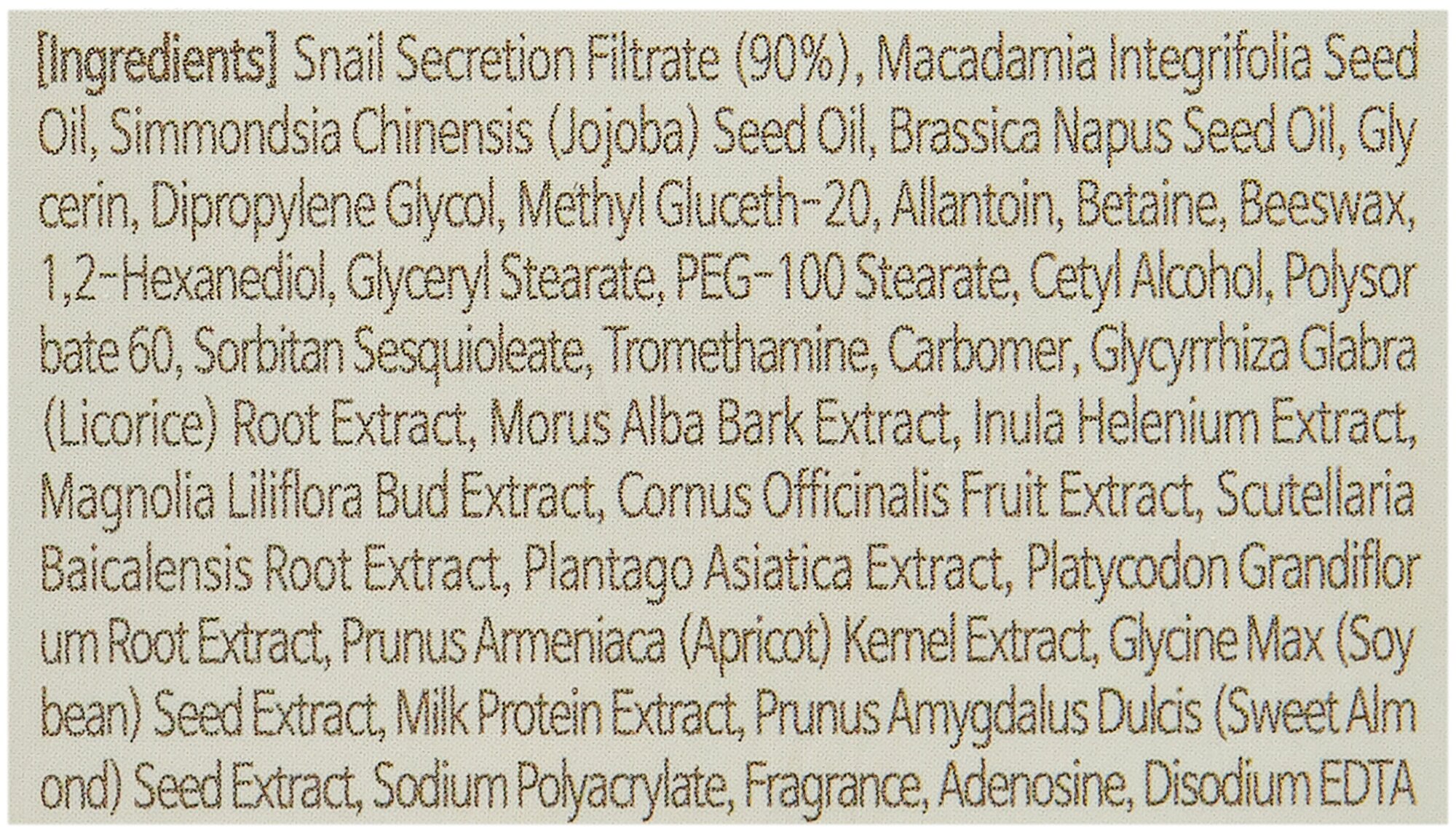| Состав | snail secretion filtrate(90%), macadamia integrifolia seed oil simmondsia chinensis (jojoba) seed oil, bras sica napus seed oil, glycerin dipropylene glycol methyl gluceth-20 allantoin betaine, bees wax, cetyl alcohol glyceryl stearate peg-loo stearate, polysorbate 6o sorbitan sesquioleate glycyrrhiza glabra (licorice) root extract. morus alba bark extract, lnula l-lelenium extract, magnolia liliflora bud extract, cornus officinalis fruit extract, scutellaria baicalensis root extract, plantago asiatica extract, platycodon grandi?orum root extract, prunus armeniaca (apricot) kernel extract, glycine max (soybean) seed extract, milk protein extract, prunus am 'gdalus dulcis (sweet ain‘iond) seed extract, tromethamine, cargomer, sodium polyacrylate, 1,2-hexanediol, adenosine, disodium edta, fragrance |