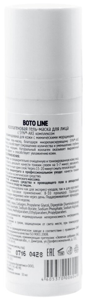 Коллагеновая маска для лица Boto Line с Syn®-ake комплексом обеспечивает эффективную коррекцию мимических морщин. Является безопасной и нетоксичной альтернативой инъекциям ботулотоксина. Гель-маска подходит для проведения самостоятельной процедуры, а также сочетается с аппаратными методиками, может применяться в качестве концентрата под альгинатную маску.