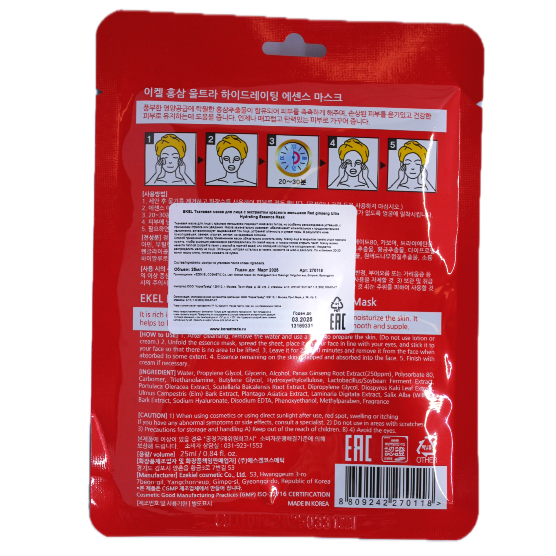 Ekel Тканевая маска с экстрактом с красного женьшеня 25 г (Ekel ) Red Ginseng Essential Mask