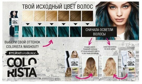 Идеальное средство для обновления вашего образа и создания цветового акцента на волосах без кардинальных изменений - это новый красящий бальзам из линии Loreal Colorista. Холодный и нежный оттенок Бирюза подойдет для темно-русых волос и светлее, брюнеткам придется чуть осветлить волосы, чтобы его получить. В зависимости от вашего оттенка цвет продержится от 7 до 14 дней и выдержит 5-10 применений шампуня. Ваш итоговый цвет зависит от исходного цвета волос и представлен в приложенной схеме оттенков. Упаковка: флакон с красящим бальзамом 80 мл, 2 пары одноразовых перчаток и инструкция по применению.