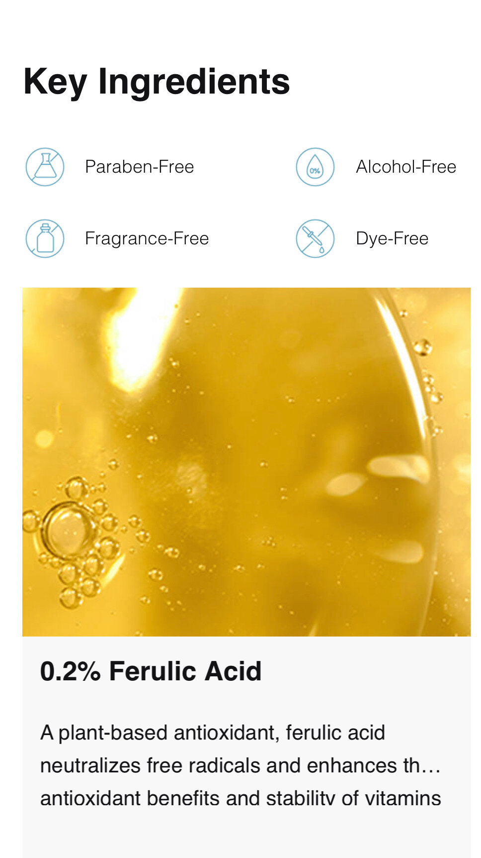 | Состав | Aqua/Water; Ascorbic Acid; Dipropylene Glycol; Ferulic Acid; Glycerin; Sodium Hyaluronate; Triethyl Citrate |