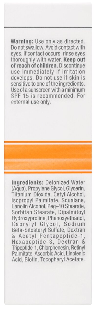 | Состав | вода, глицерин, диоксид титана, сквален, дипальмитоил гидроксипролин, бета-ситостерол сульфат натрия, декстран, ацетил пентапептид-1, трипептид-1, ацетил гексапептид-3, ретинола пальмитат, аскорбиновая кислота, линоленовая кислота, биотин, токоферола ацетат |