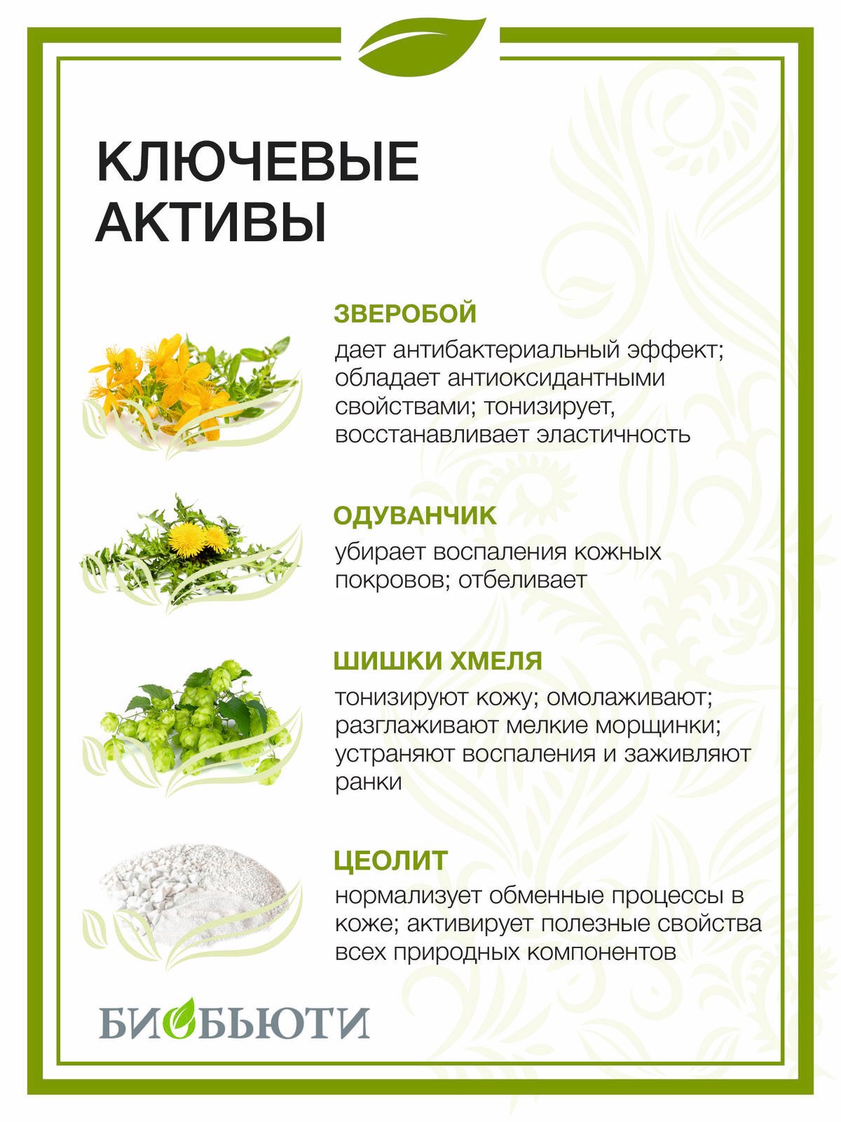 | Активные компоненты | - Природный цеолит; - каолиновые глины; - соль Мертвого моря; - медь; - ржаные отруби; - пшеничные отруби; - зверобой; - цветки ромашки; - липовый цвет; - листья розы; - листья подорожника; - листья земляники; - цветки василька синего; - тысячелистник; - полынь горькая; - плоды можжевельника; - корень одуванчика; - корень лопуха; - корень солодки; |