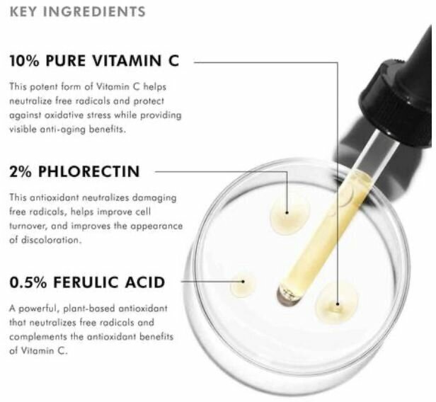 L-аскорбиновая кислота (чистый витамин С) – 10%. Антиоксидантное, восстанавливающее действие. Повышает защитные свойства кожи. Стимулирует коллагеногенез, препятствует фотостарению. Оказывает противовоспалительное действие Феруловая кислота – 0.5 %. Мощное антиоксидантное действие. Стабилизирует витамин С и витамин E, повышает их эффективность. Повышает защитные свойства кожи. Корректирует признаки старения. Флоретин – 2%. Высокая эффективность в борьбе со свободными радикалами. Обеспечивает более высокий уровень защиты от повреждений ДНК под воздействием UV-лучей. Оказывает противовирусное, антибактериальное, противовоспалительное действие.
