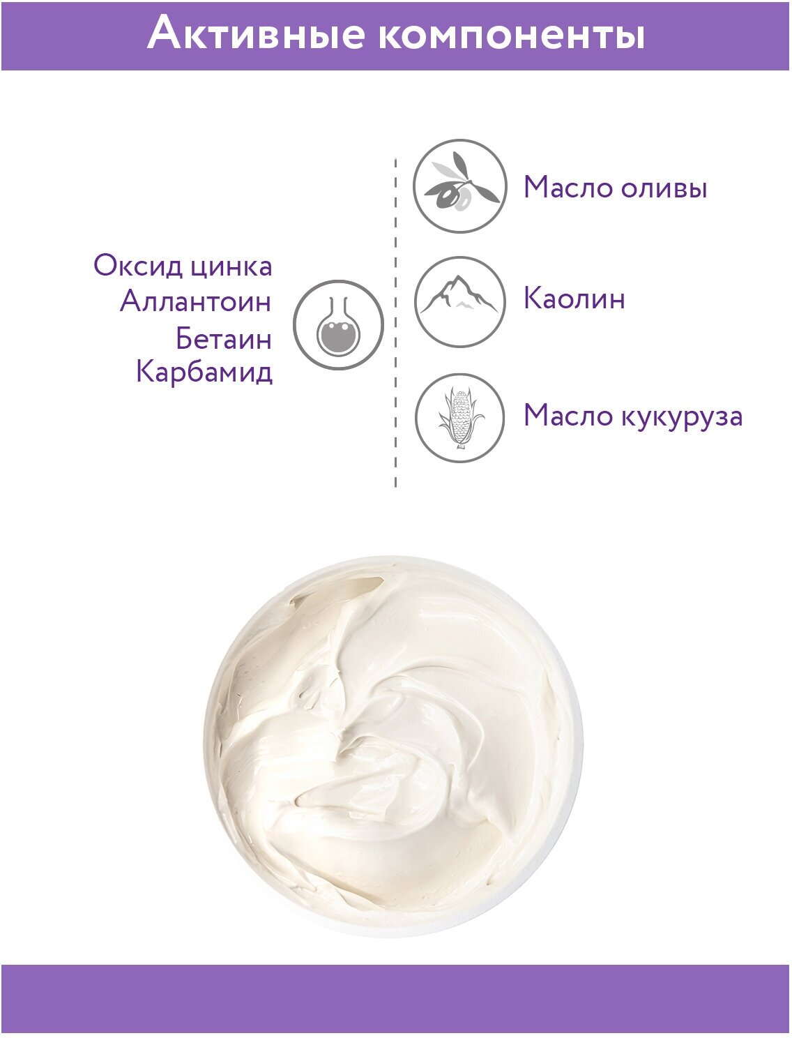 Aqua, ZeaMays (Corn) Oil, Zink Oxide, Kaolin, Emulsifying Wax, Olea Europaea (olive) Fruit Oil, Stearic Acid, Glycerin, Betaine, Urea, Cetearyl Alcohol, Allantoin, Bisabolol, Triethanolamine, ВНТ, Parfum, Benzyl Alcohol, Methylchloroisothiazoline, Methylisothiazoline.