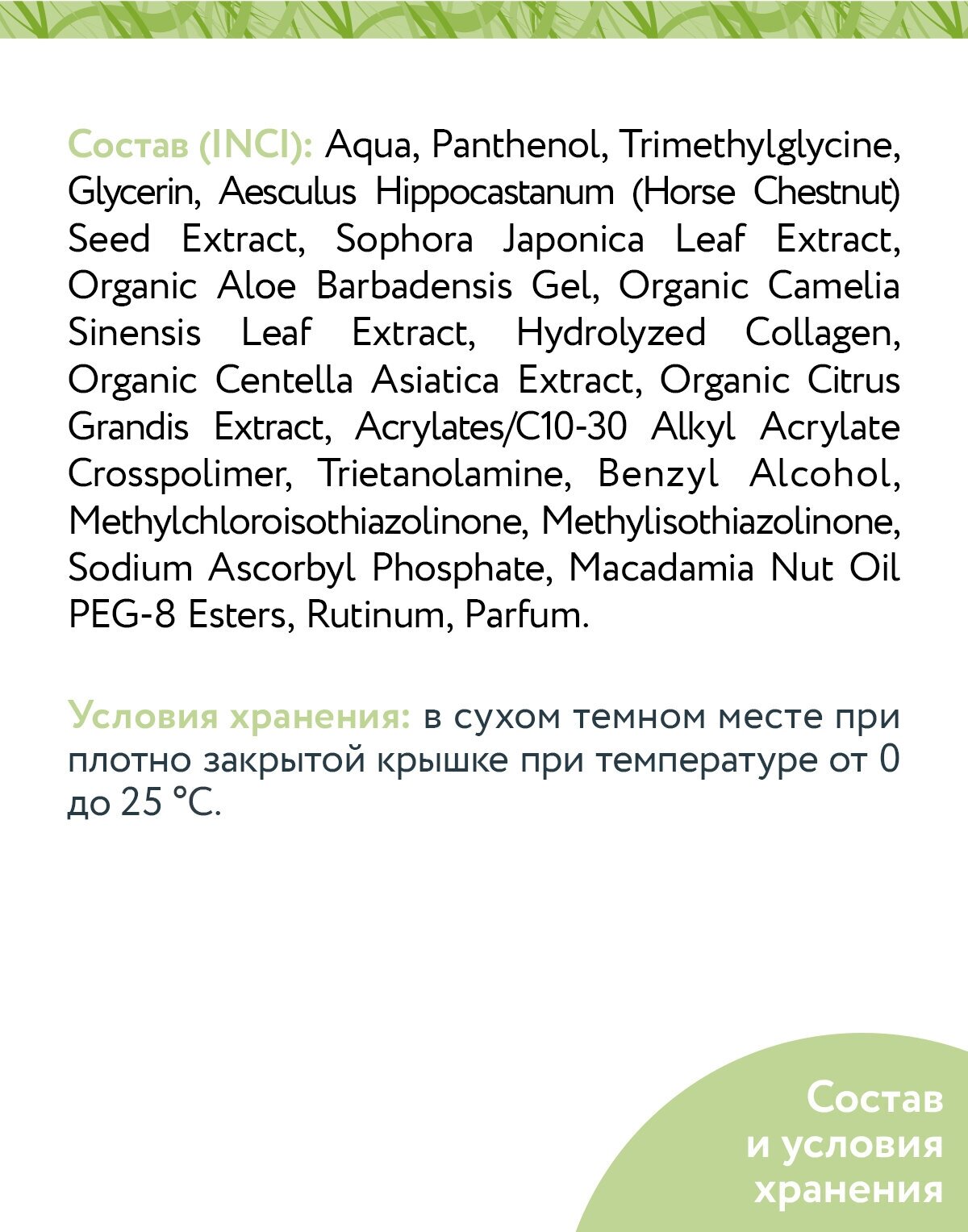| Состав | Aqua, Panthenol, Trimethylglycine, Glycerin, Horse Chestnut Seed Extract, Sophora Japonica Leaf Extract, Organic Aloe Barbadensis Gel, Organic Camelia Sinensis Leaf Extract, Hydrolyzed Collagen, Organic Centella Asiatica Extract, Organic Citrus Grandis Extract, Acrylates/C10-30 Alkyl Acrylate Crosspolimer, Trietanolamine, Benzyl Alcohol, Methylchloroisothiazolinone, Methylisothiazolinone, Sodium Ascorbyl Phosphate, Macadamia Nut Oil PEG-8 Esters, Rutinum, Parfum |
