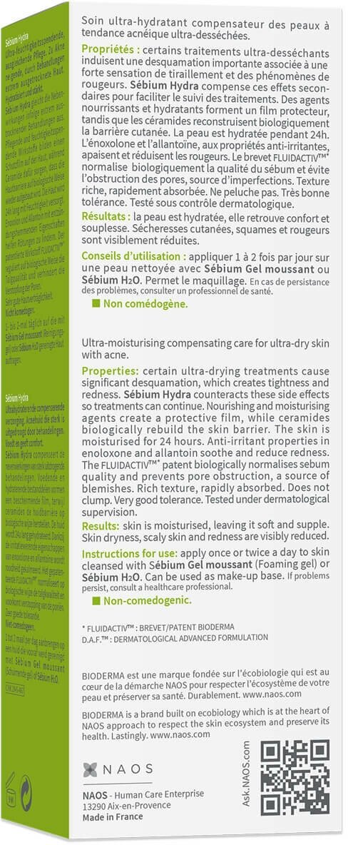 В период лечения тяжелых форм акне кожа может очень сильно сохнуть, трескаться, раздражаться и испытывать общий дискомфорт. Крем Bioderma Sébium Hydra помогает восстановить кожу, качественно и надолго увлажнить ее и успокоить. Результаты тестов показывают, что после 14 дней использования в 89% случаев дерматологи, наблюдающие пациентов, заметили разницу. Средство восстанавливает защитный барьер кожи и предотвращают преждевременную потерю влаги. Прекрасно увлажняет и смягчает кожу. Успокаивает и повышает переносимость. Рекомендовано дерматологами.