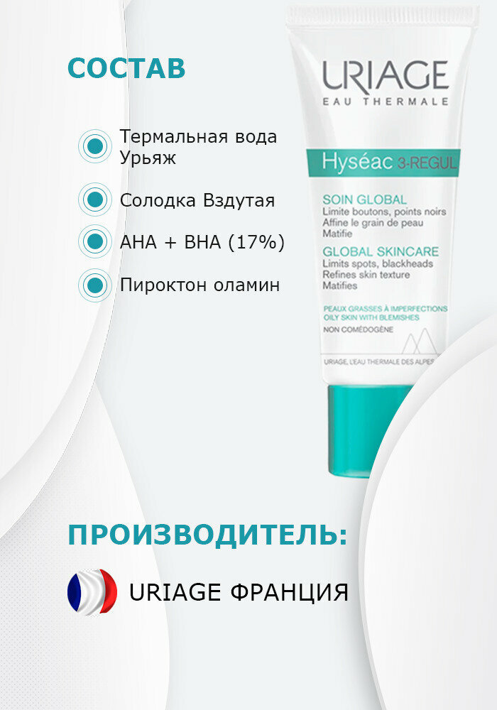| Активный ингредиент | Термальная Вода Урьяж, Солодка вздутая, AHA+ВНА (17%), Пироктон оламин, Экстракт чечевицы, MPA-regul комплекс, TLR2-Regul |