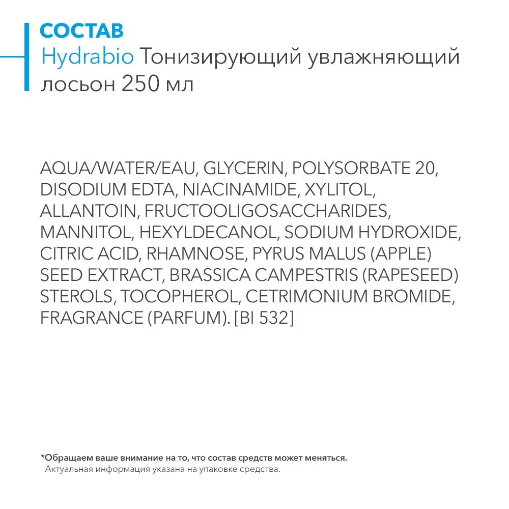 | Состав | aqua/water/eau, glycerin, polysorbate 20, mannitol, xylitol, rhamnose, fructooligosaccharides, niacinamide, allantoin, pyrus malus (apple) fruit extract, hexyldecanol, disodium edta, sodium hydroxide, citric acid, cetrimonium bromide, fragrance (parfum). [bi 532] |