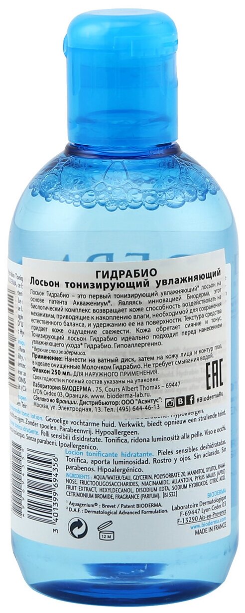 | Способ применения | Только для наружного применения. Нанести на ватный диск и протереть кожу лица и контура глаз. Не требует смывания водой. Использовать утром и/или вечером. Подходит для ежедневного применения. Рекомендуем использовать его сразу после очищения и перед нанесением основного ухода, например, сыворотки и увлажняющего крема Hydrabio.Срок годности после вскрытия – 12 месяцев. |