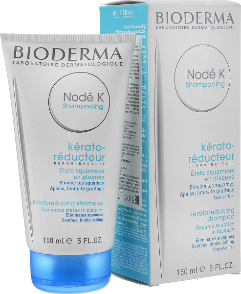 Шампунь Bioderma Nodé K используют при псориазе с поражением кожи головы. Формула адаптирована для раздраженной и чувствительной кожи. Его можно применять как при хронических случаях, так и при рецидиве. При регулярном использовании шампунь снимает раздражение, воспаление и предотвращает образование новых чешуек. Формула представляет собой мягкую очищающую базу с кислотами, которые помогают контролировать возвращение симптомов. Рекомендовано дерматологами.