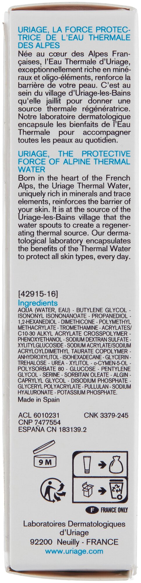 | Активный ингредиент | Термальная Вода Урьяж, Гиалуроновая кислота, Альгинат, Пуллулан, Акваксил, Сульфат декстрана |
