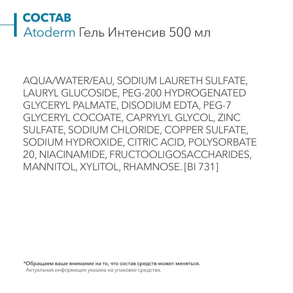 Состав (без мыла, парабенов, отдушек и красителей): aqua/water/eau, sodium laureth sulfate, lauryl glucoside, peg-200 hydrogenated glyceryl palmate, disodium edta, peg-7 glyceryl cocoate, sodium chloride, caprylyl glycol, zinc sulfate, copper sulfate, sodium hydroxide, citric acid, polysorbate 20, niacinamide, fructooligosaccharides, mannitol, xylitol, rhamnose. [bi 730]