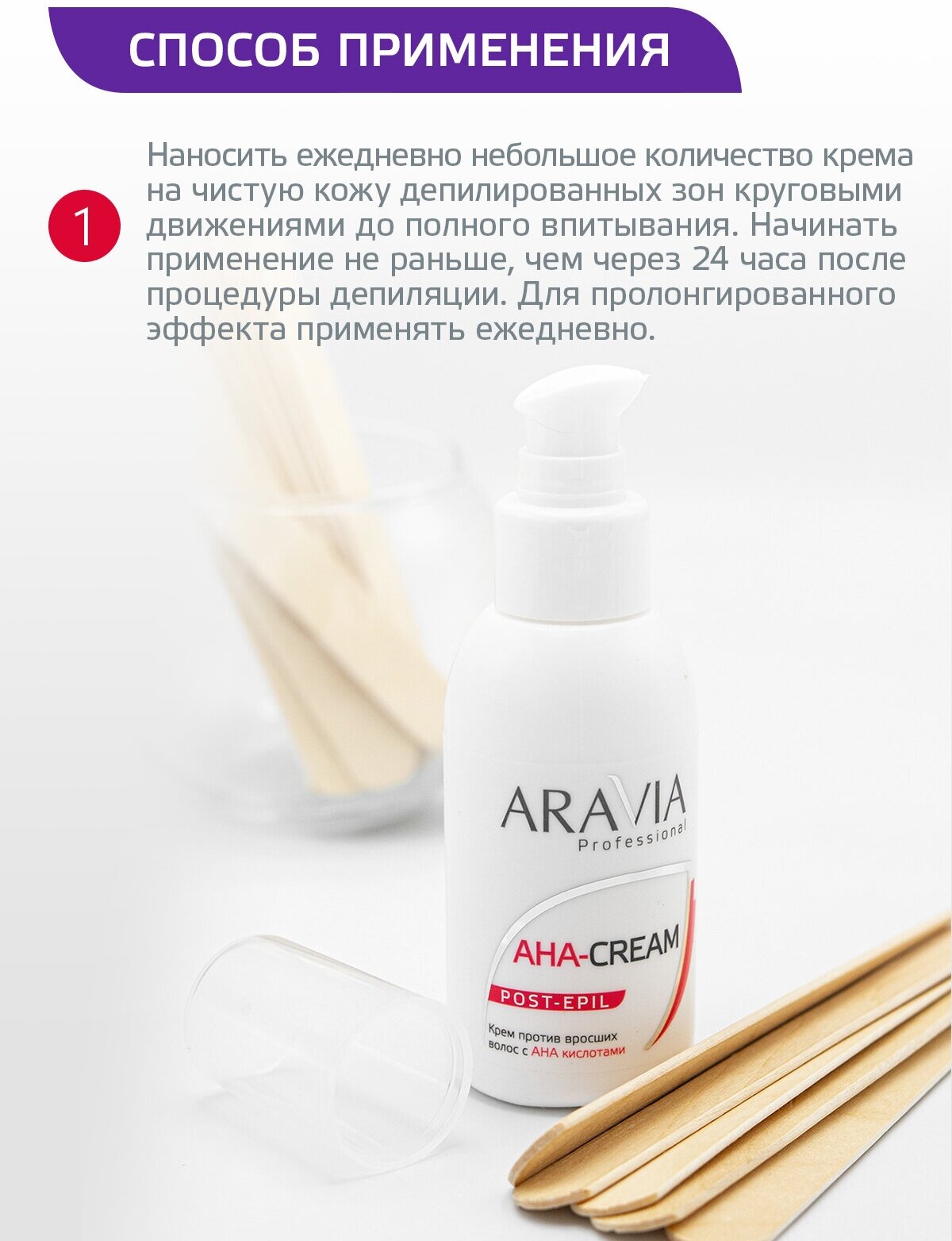 Наносить ежедневно небольшое количество крема на чистую кожу депилированных зон круговыми движениями до полного впитывания. Начинать применение не раньше, чем через 24 часа после процедуры депиляции.