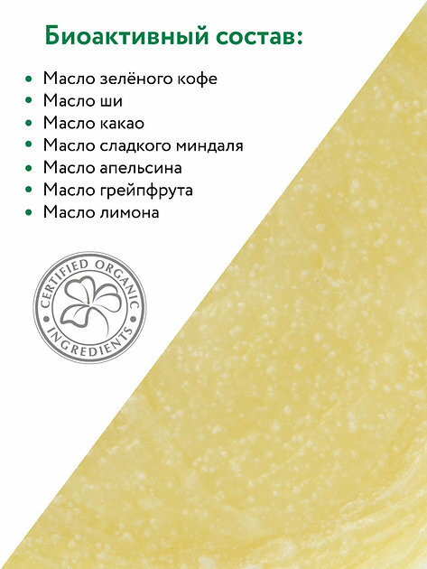 | Активный ингредиент | какао масло, масло ши (карите), миндальное масло, масло грейпфрута, масло апельсина, масло лимона, масло зелёного кофе |