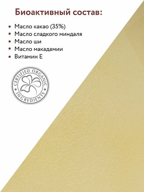 | Активный ингредиент | масло какао, масло сладкого миндаля, масло ши, масло макадамии, витамин Е |