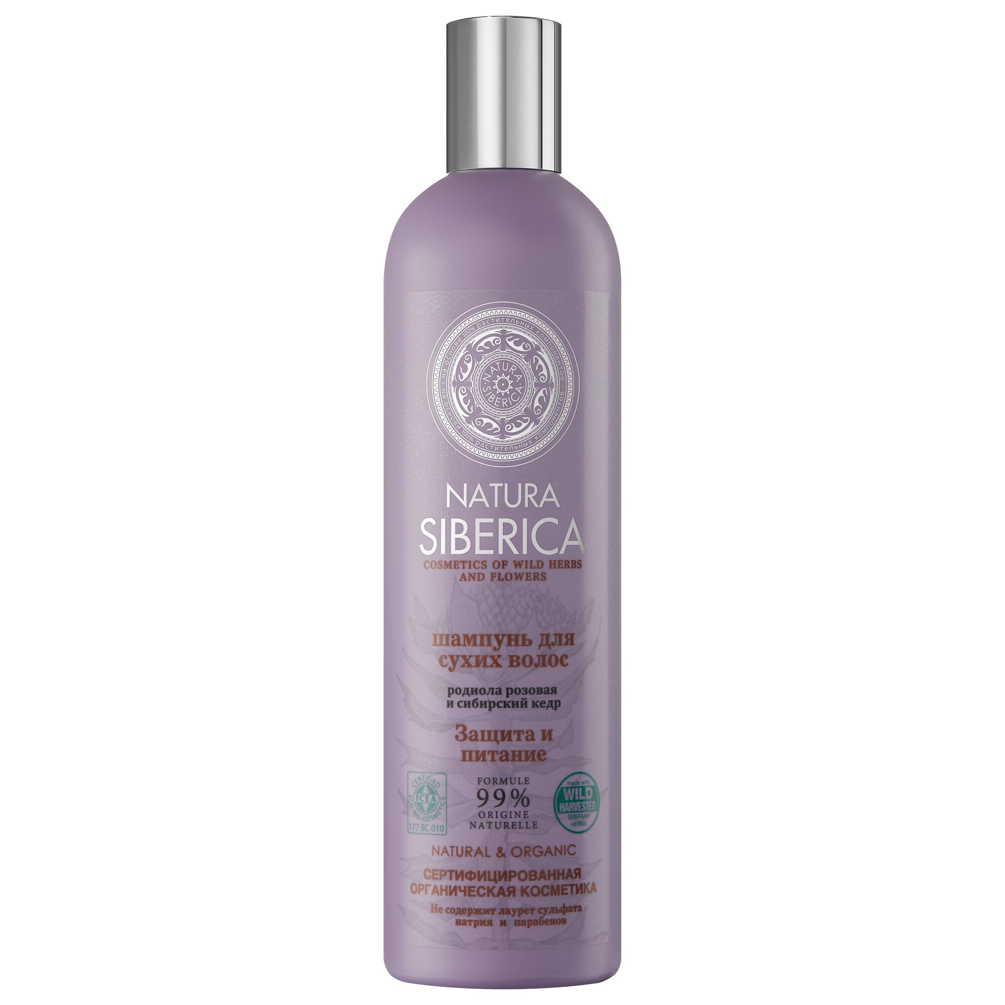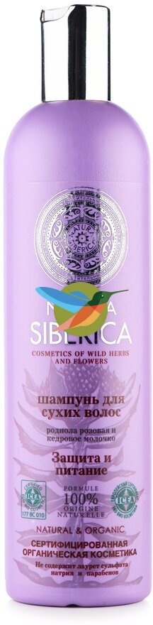 Шампунь для защиты сухих волос Natura Siberica производится на основе экстрактов родиолы розовой и кедрового молочка с добавлением масла облепихи алтайской. Экстракт родиолы розовой имеет совершенно уникальный состав, превосходящий по своим свойствам даже знаменитый женьшень. Родиолу розовую ещё называют золотым корнем. Её главное положительное свойство - увеличение в разы жизненной силы волос и их устойчивости к внешним воздействиям. В свою очередь кедровое молочко, называемое ещё молочком молодости, содержит огромное количество главного природного омолаживающего вещества, витамина и антиоксиданта Е. В свою очередь, для питания клеток волоса используется эфирное масло облепихи алтайской.