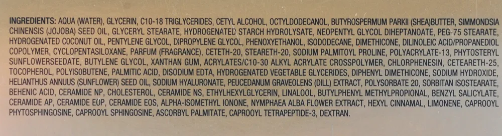 | Состав | Aqua (water), glycerin, c10-18 triglycerides, cetyl alcohol, octyldodecanol, butyrospermum parkii (shea) butter, simmondsia chinensis (jojoba) seed oil, glyceryl stearate, hydrogenated starch hydrolysate, neopentyl glycol diheptanoate, peg-75 stearate, hydrogenated coconut oil, pentylene glycol, dipropylene glycol, phenoxyethanol, isododecane, dimethicone, dilinoleic acid/propanediol copolymer, cyclopentasiloxane, parfum (fragrance), ceteth-20, steareth-20, sodium palmitoyl proline, polyacrylate-13, phytosteryl sunflowerseedate, butylene glycol, xanthan gum, acrylates/c10-30 alkyl acrylate crosspolymer, chlorphenesin, ceteareth-25, tocopherol, polyisobutene, palmitic acid, disodium edta, hydrogenated vegetable glycerides, diphenyl dimethicone, sodium hydroxide, helianthus annuus (sunflower) seed oil, sodium hyaluronate, peucedanum graveolens (dill) extract, polysorbate 20, sorbitan isostearate, behenic acid, ceramide np, cholesterol, ceramide ns, ethylhexylglycerin, linalool, butylphenyl methylpropional, benzyl salicylate, ceramide ap, ceramide eop, ceramide eos, alpha-isomethyl ionone, nymphaea alba flower extract, hexyl cinnamal, limonene, caprooyl phytosphingosine, caprooyl sphingosine, ascorbyl palmitate, caprooyl tetrapeptide-3, dextran |