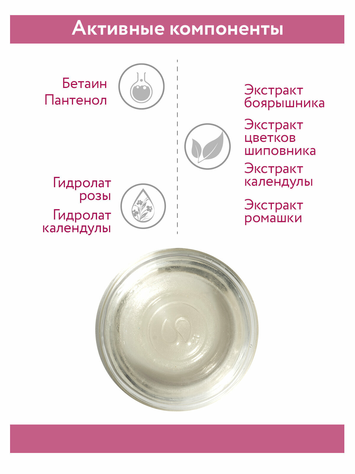 | Активные компоненты | Aqua, Rosa damascena flower water, Calendula officinalis water, Betaine, PEG-40 Hydrogenated Castor Oil, Crataegus Monogina Fruit Extract, Rosa Сanina Flower Extract, Calendula Officinalis Flower Extract, Pantenol, Chamomilla Recutita (Flower) Extract, DMDM Hydantoin, Iodopropynyl Butylcarbamate, Citric Acid, Parfum |