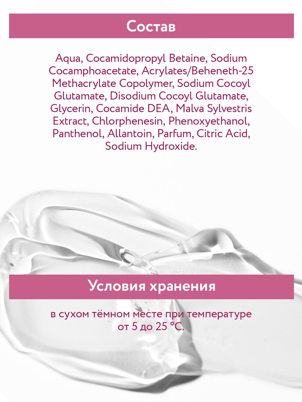 | Активные компоненты | Экстракт мальвы, пантенол, аллантоин, глицерин.(INCI) Aqua, Cocamidopropyl Betaine, Sodium Cocamphoacetate, Acrylates/Beheneth-25 Methacrylate Copolymer, Sodium Cocoyl Glutamate, Disodium Cocoyl Glutamate, Glycerin, Cocamide DEA, Malva Sylvestris Extract, Chlorphenesin, Phenoxyethanol, Panthenol, Allantoin, Parfum, Citric Acid, Sodium Hydroxide. |