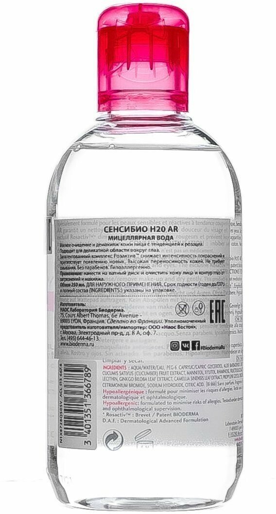 | Полное описание | Мицеллярная вода Sensibio H2O AR для кожи с розацеа и покраснениями - это первая мицеллярная вода, которая на биологическом уровне помогает снизить чувствительность кожи и уменьшить покраснения еще на моменте очищения кожи. В составе находится патент «Розактив», который отвечает за воздействие на один из главных факторов, ответственных за повреждение капилляров.Мицеллярная вода подходит для демакияжа и очищения кожи лица и области вокруг глаз. Помогает успокоить кожу и снять неприятные ощущения. |
