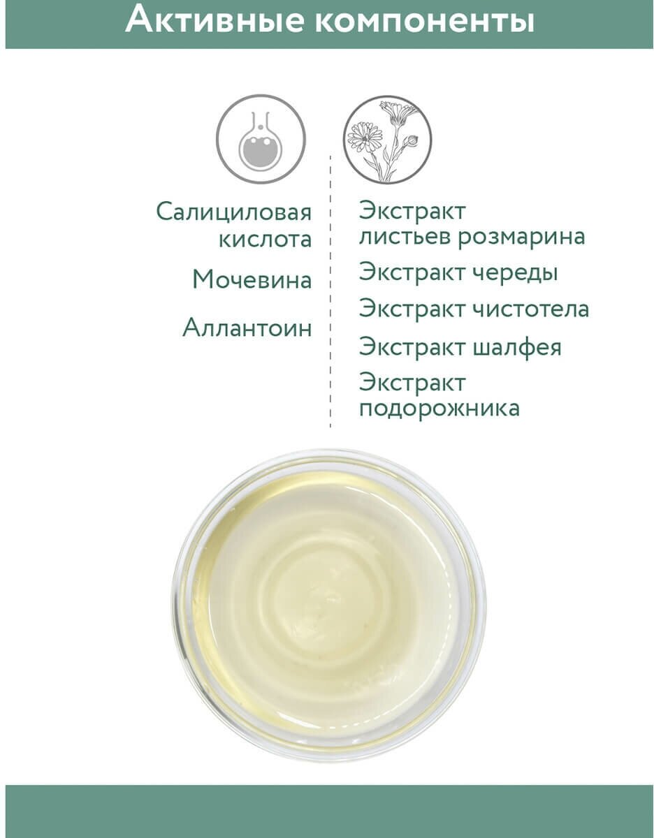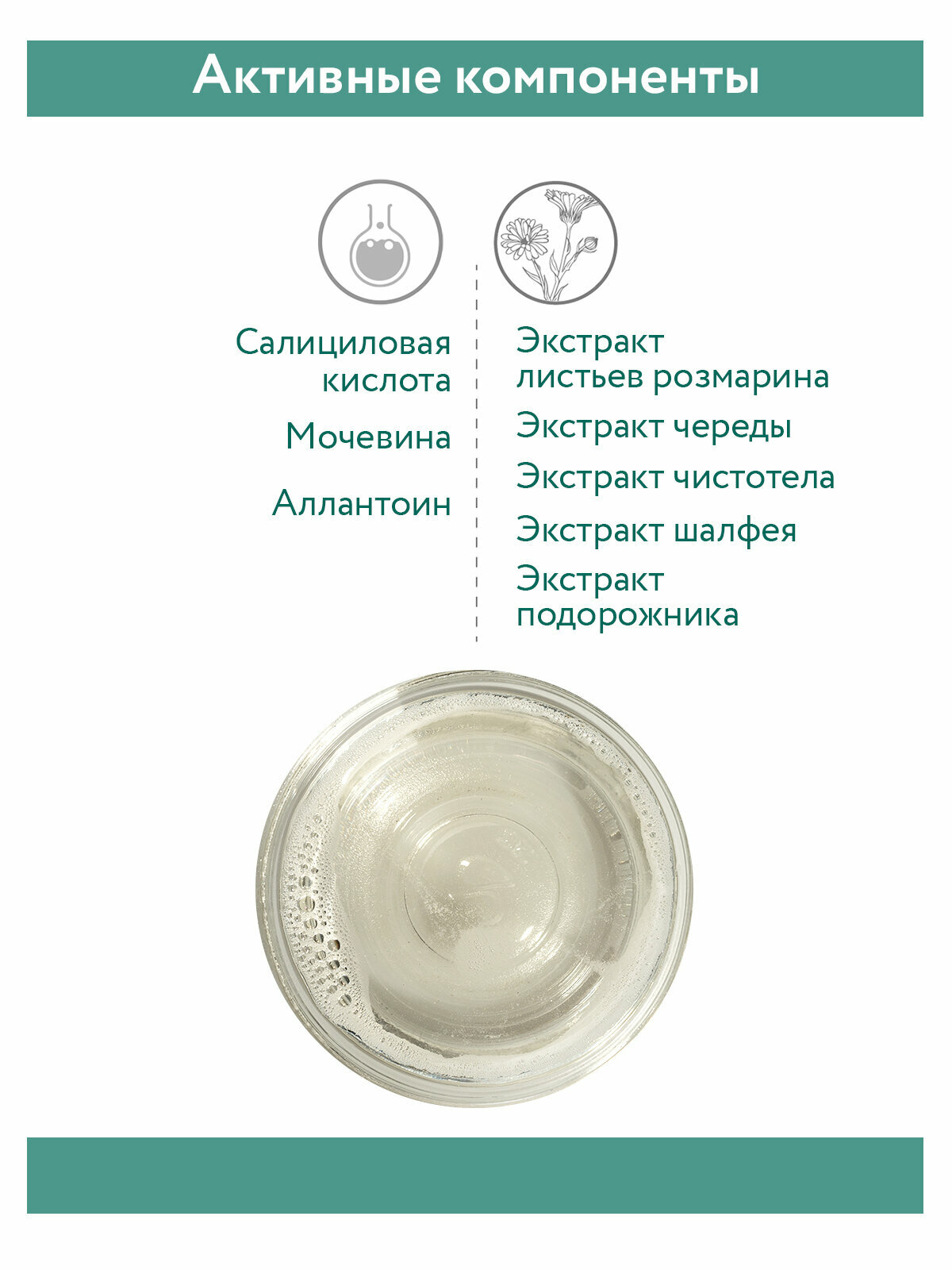 | Активные компоненты | Салициловая кислота, экстракт листьев розмарина, экстракт череды, экстракт чистотела, экстракт шалфея, экстракт подорожника, глицерин, мочевина, аллантоин(INCI) Aqua, Rosmarinus Officinalis (Rosemary) Leaf Extract, Bidens Tripartita Flower Extract, Chelidonium majus Extract, Salvia Sclarea Flower Extract, Plantago Major Leaf Extract, Glycerin, Urea, Pantenol, PEG-40 Hydrogenated Castor Oil, Allantoin, Salicylic Acid, Sulfurized TEA-Ricinoleate, DMDM Hydantoin, Iodopropynyl Butylcarbamate, Sodium Hydroxide |