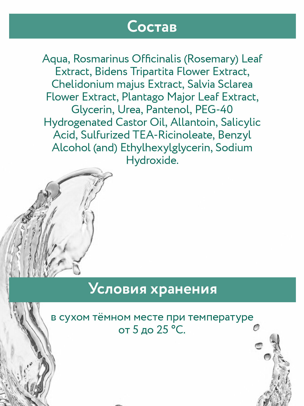 | Состав | Aqua, Rosmarinus Officinalis (Rosemary) Leaf Extract, Bidens Tripartita Flower Extract, Chelidonium majus Extract, Salvia Sclarea Flower Extract, Plantago Major Leaf Extract, Glycerin, Urea, Pantenol, PEG-40 Hydrogenated Castor Oil, Allantoin, Salicylic Acid, Sulfurized TEA-Ricinoleate, DMDM Hydantoin, Iodopropynyl Butylcarbamate, Sodium Hydroxide. |