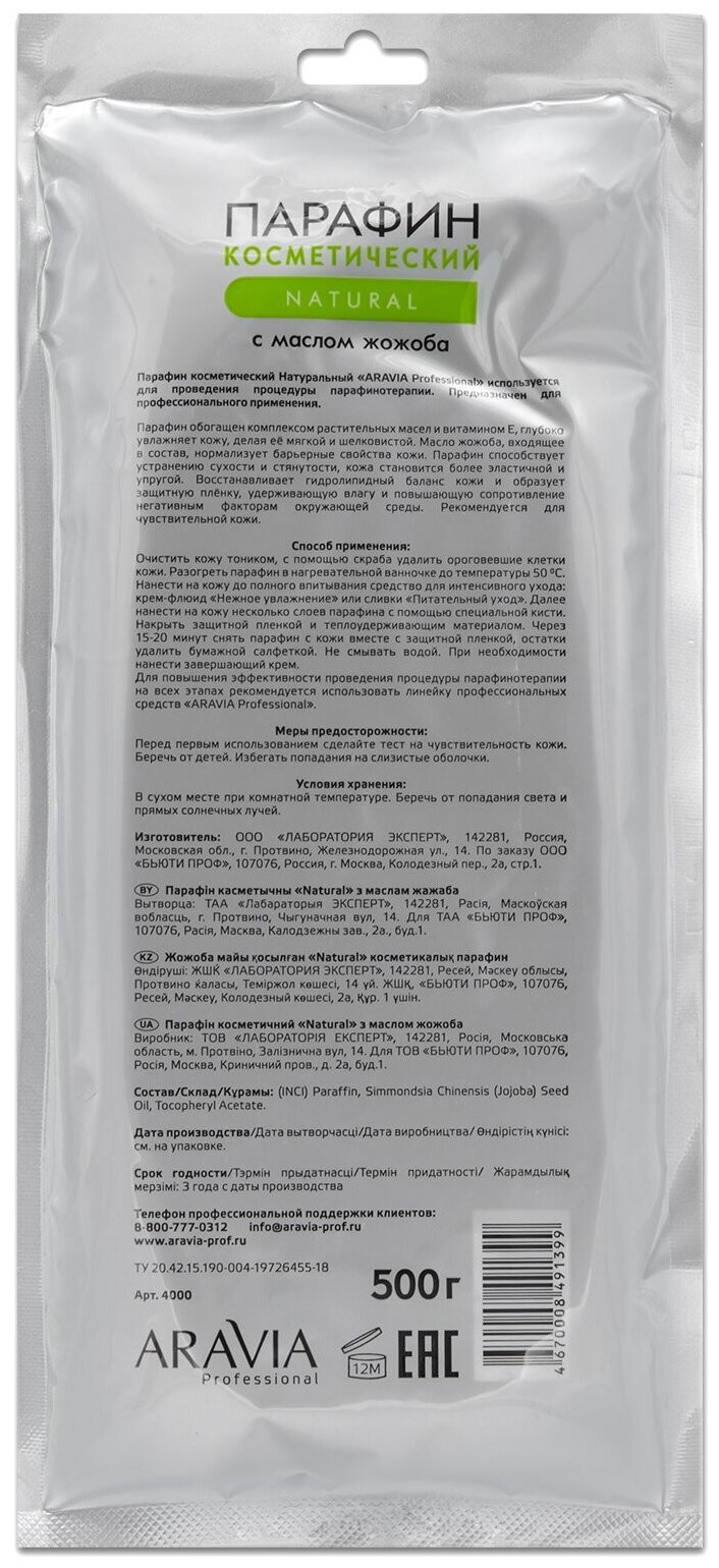 Aravia professional Парафин с маслом жожоба "Натуральный" 500 гр (Aravia professional ) Парафин косметический натуральный Spa - Manicure, с маслом жожоба