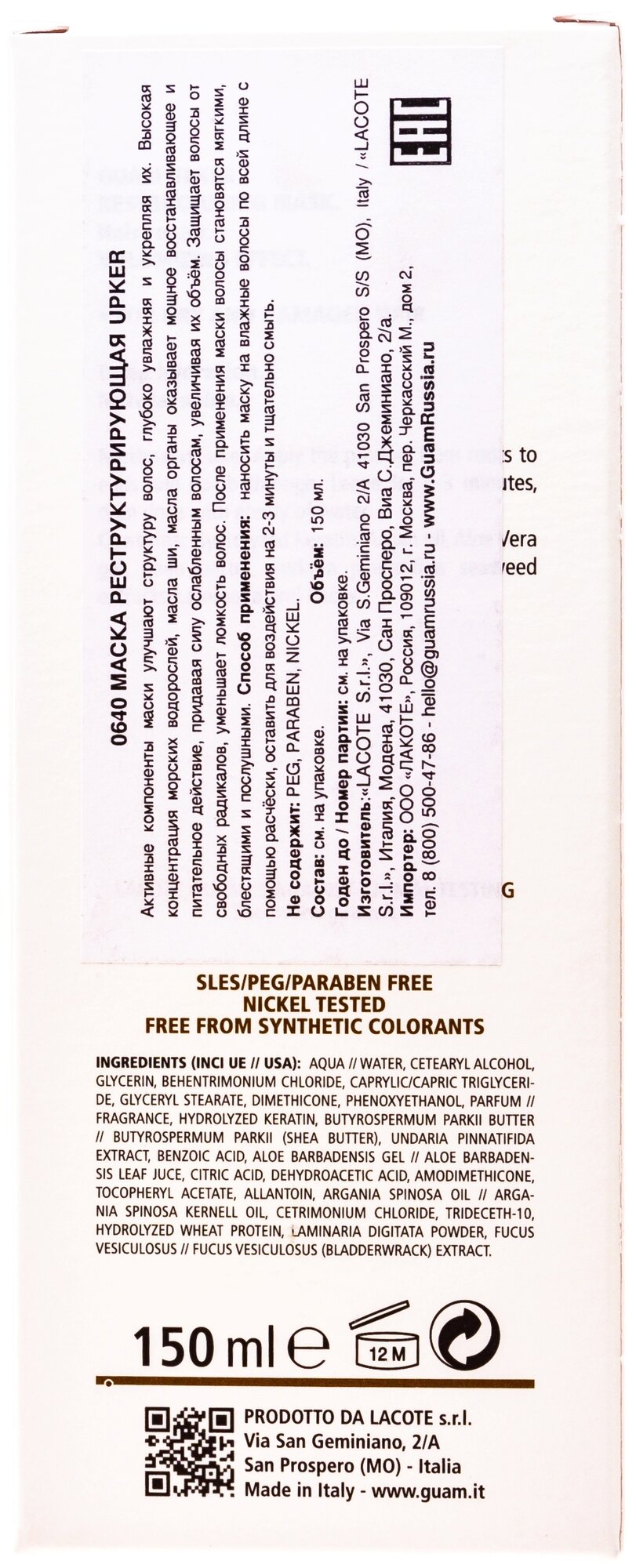 | Активный ингредиент | гидролизат кератина, масло аргана, гель алое вера, масло ши, экстракт водоросли Undaria Pinnatifida, экстракт ламинарии, экстракт фукуса пузырчатого |