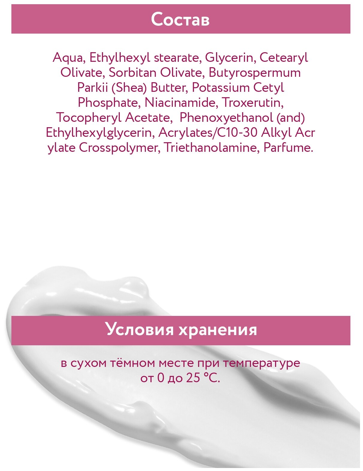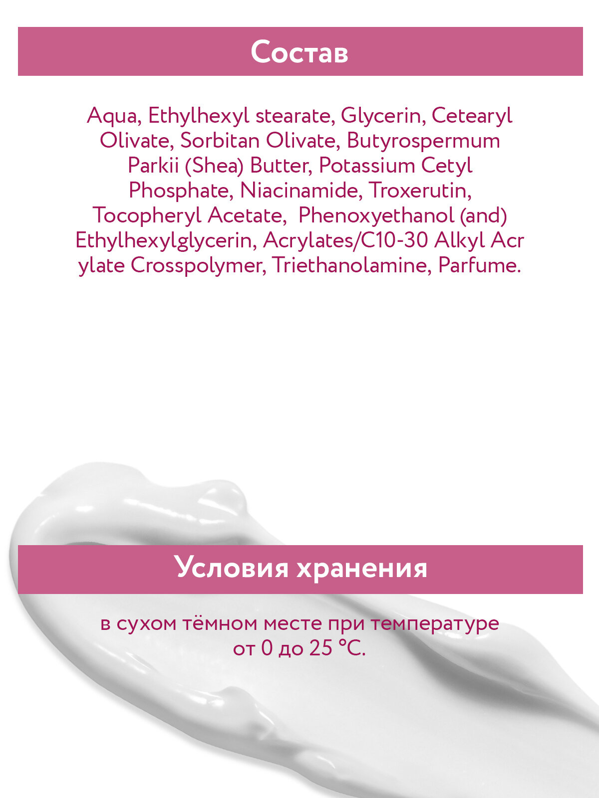 | Активные компоненты | Аqua, Ethylhexyl stearate, Glycerin, Cetearyl Olivate, Sorbitan Olivate, Butyrospermum Parkii (Shea) Butter, Potassium Cetyl Phosphate, Niacinamide, Troxerutin, Tocopheryl Acetate, Phenoxyethanol, Methylparaben, Ethylparaben, Propylparaben, Acrylates/C10-30 Alkyl Acrуlate Crosspolymer, Triethanolamine, BHT, DMDM Hydantoin, Parfume. |
