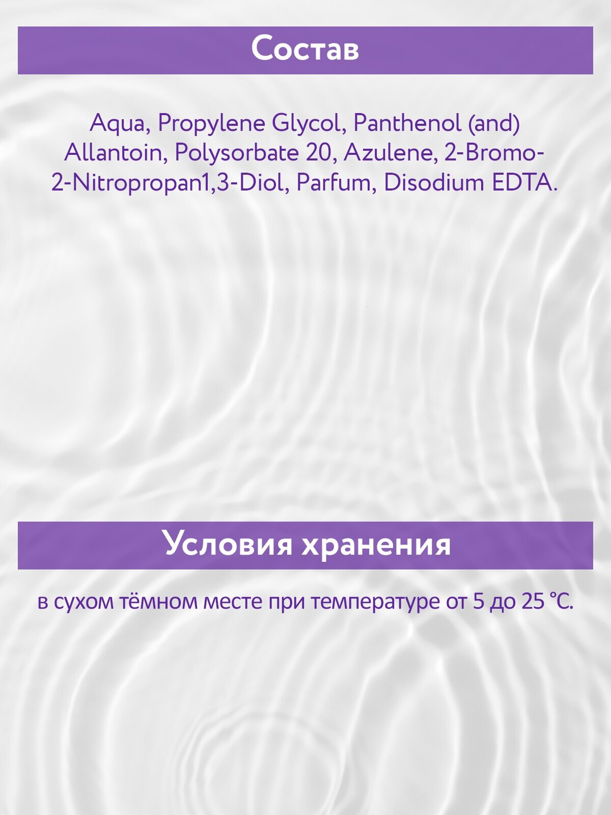 | Активные компоненты | Aqua, Propylene Glycol, Panthenol (and) Allantoin, Polysorbate 20, Azulene, 2-Bromo-2-Nitropropan1,3-Diol, Parfum, Disodium EDTA. |