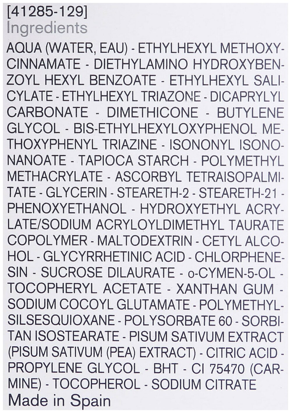 Состав: aqua (water, eau), ethylhexyl methoxycinnamate, diethylamino hydroxybenzoyl hexyl benzoate, ethylhexyl salicylate, ethylhexyl triazone, dicaprylyl carbonate, dimethicone, butylene glycol, bis-ethylhexyloxyphenol methoxyphenyl triazine, isononyl isononanoate, tapioca starch, polymethyl methacrylate, ascorbyl tetraisopalmitate, glycerin, steareth-2, steareth-21, phenoxyethanol, hydroxyethyl acrylate/sodium acryloyldimethyl taurate copolymer, maltodextrin, cetyl alcohol, glycyrrhetinic acid, chlorphenesin, sucrose dilaurate, o-cymen-5-ol, tocopheryl acetate, xanthan gum, sodium cocoyl glutamate, polymethylsilsesquioxane, polysorbate 60, sorbitan isostearate, pisum sativum extract (pisum sativum (pea) extract), citric acid, propylene glycol, bht, ci 75470 (carmine), tocopherol, sodium citrate