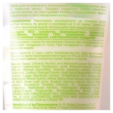 | Применение | нанесите на подсушенные полотенцем волосы по длине и на концы, прочешите. Оставьте на 5-10 минут, тщательно смойте. Использовать 1-2 раза в неделю |