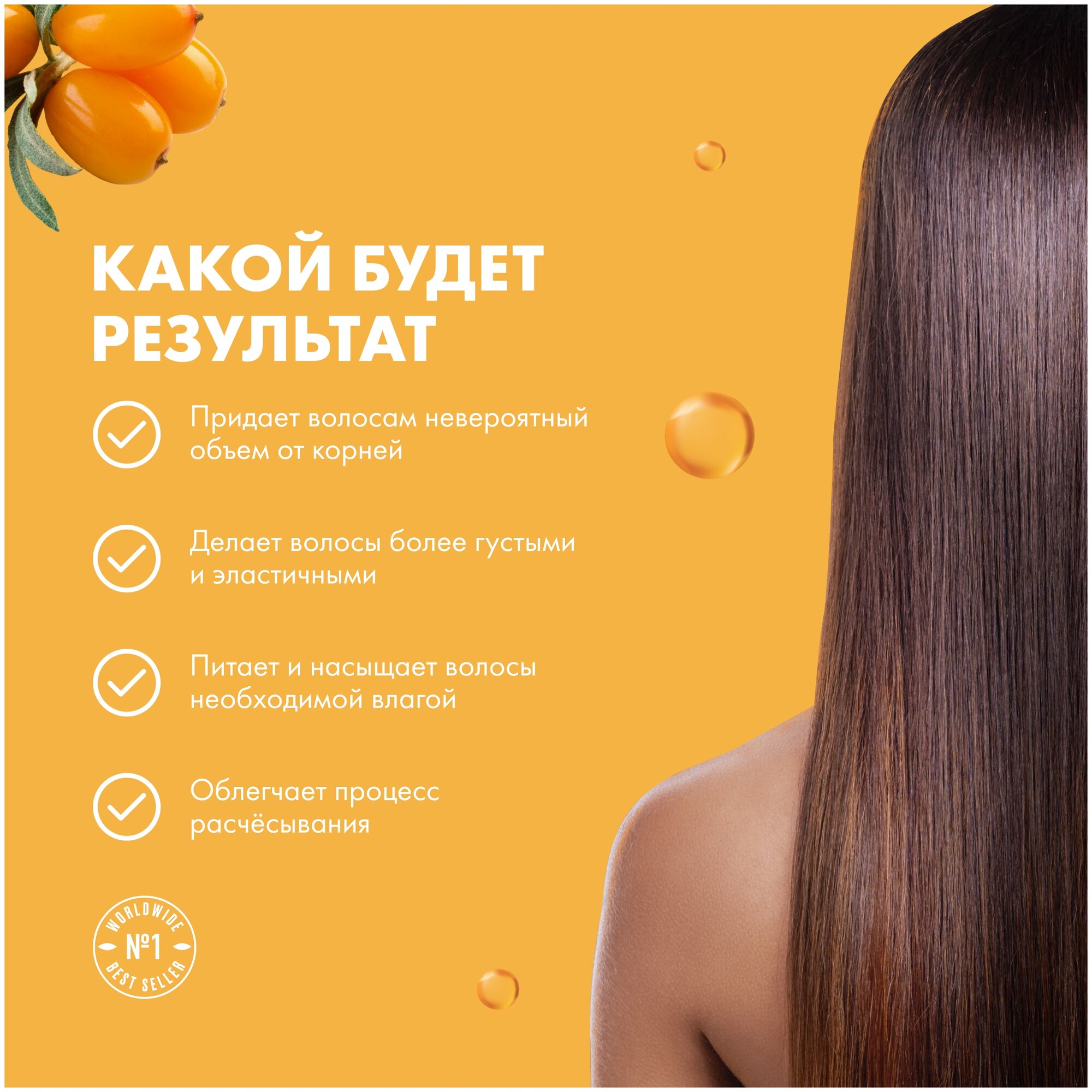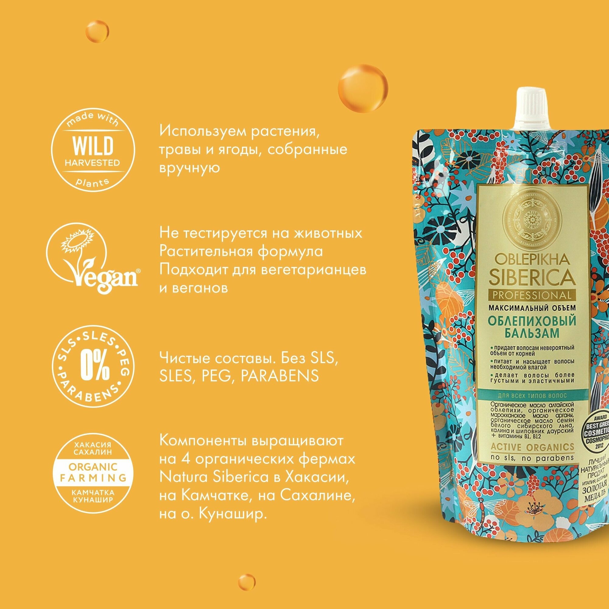 Придает волосам максимальный объем, блеск и густоту, защищая их от термовоздействия при горячей укладке. Оживляет и приподнимает волосы от корней, не утяжеляя их. Облегчает процесс расчесывания. Входящие в состав бальзама витамины и аминокислоты питают и восстанавливают волосы. После применения бальзама волосы приобретают волнительную красоту и головокружительный объем. Масло алтайской облепихи, марокканское масло арганы и масло семян белого сибирского льна способствуют образованию кератина, обеспечивающего волосам прочность и блеск. Калина и шиповник даурский сохраняют влагу в структуре волос.