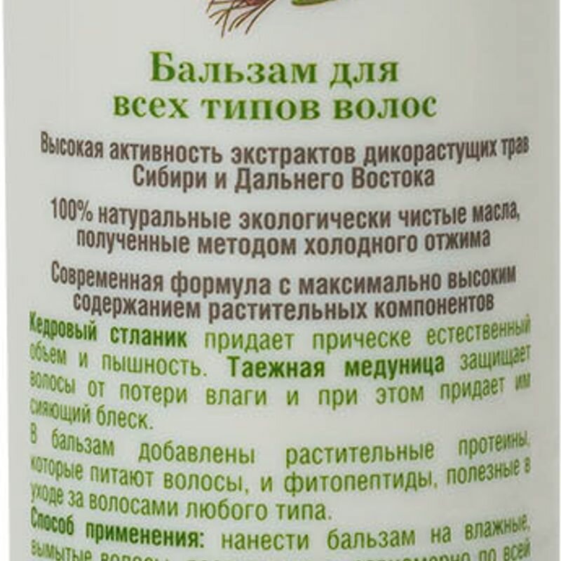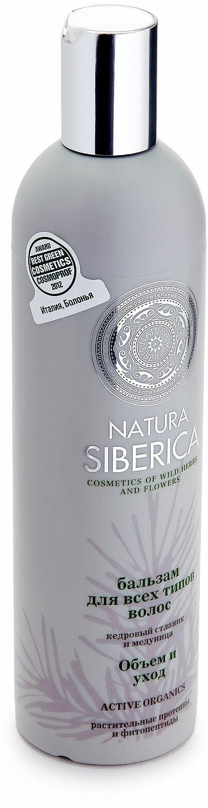 Формула бальзама для придания объема для всех типов волос Natura Siberica содержит натуральные экстракты медуницы и кедрового стланика. Медуница, как известно, очень богата витаминами А, Е, В и С, благодаря чему применение её в формуле позволяет сделать защиту и питание не только эффективными, но также и долговременными.