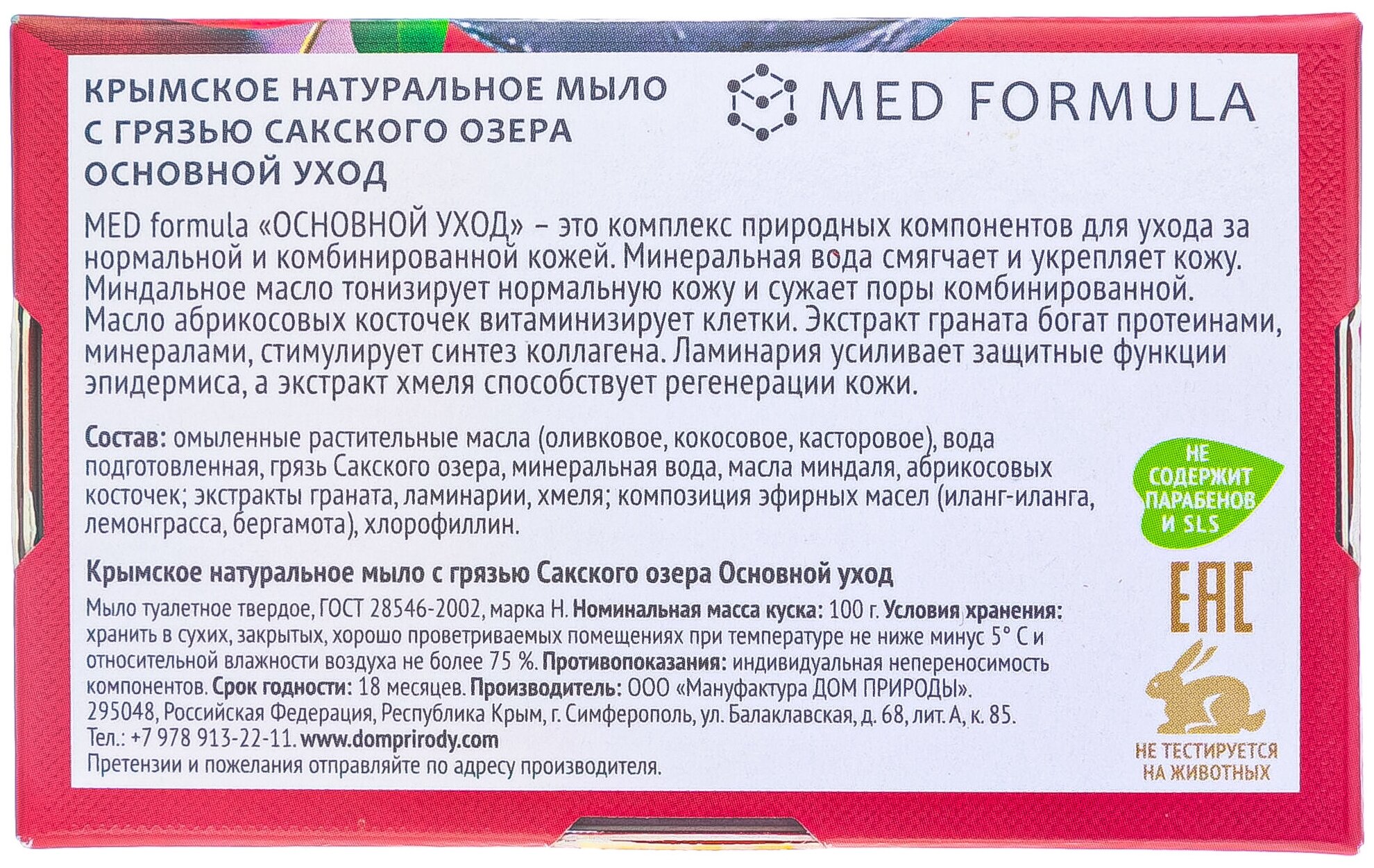 | Состав набора | Мыло ДОМ ПРИРОДЫ на основе грязи Сакского озера ОСНОВНОЙ УХОД 100 г |