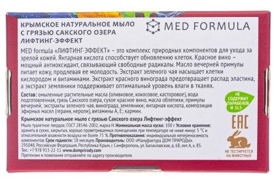 | Состав набора | Мыло ДОМ ПРИРОДЫ на основе грязи Сакского озера ЛИФТИНГ-ЭФФЕКТ 100 г |