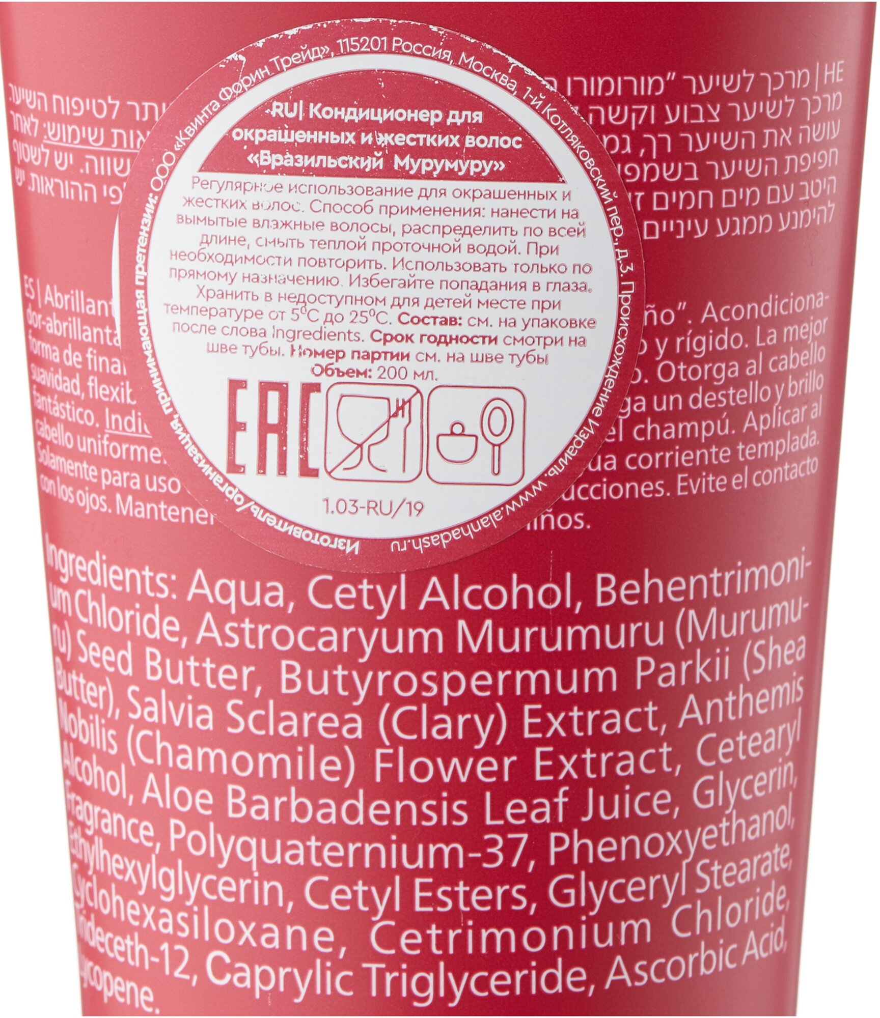| Состав | Aqua, cetyl alcohol, behentrimonium chloride, astrocaryum murumuru (murumuru) seed butter, butyrospermum parkii (shea butter), salvia sclarea (clary) extract, anthemis nobilis (chamomile) flower extract, cetearyl alcohol, aloe barbadensis leaf juice, glycerin, perfume, polyquaternium-37, phenoxyethanol, ethylhexylglycerin, cetyl esters, glyceryl stearate, cyclohexasiloxane, cetrimonium chloride, trideceth-12, сaprylic triglyceride, ascorbic acid, lycopene |