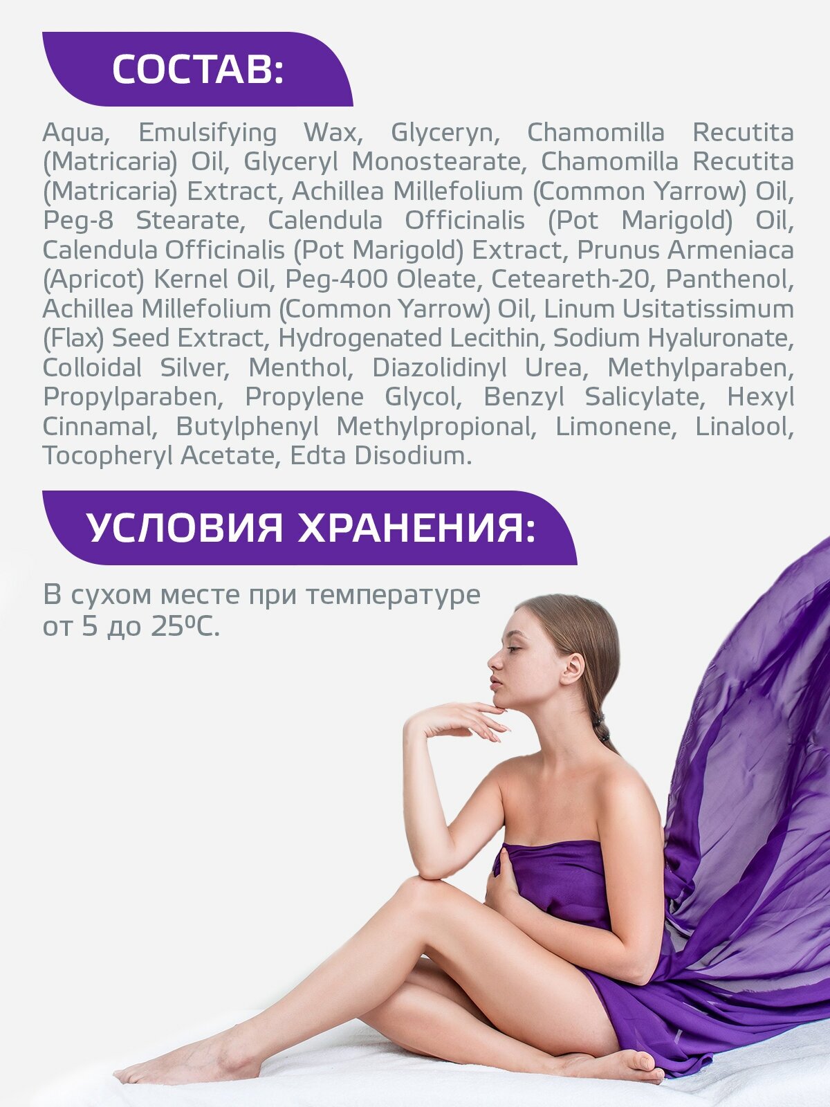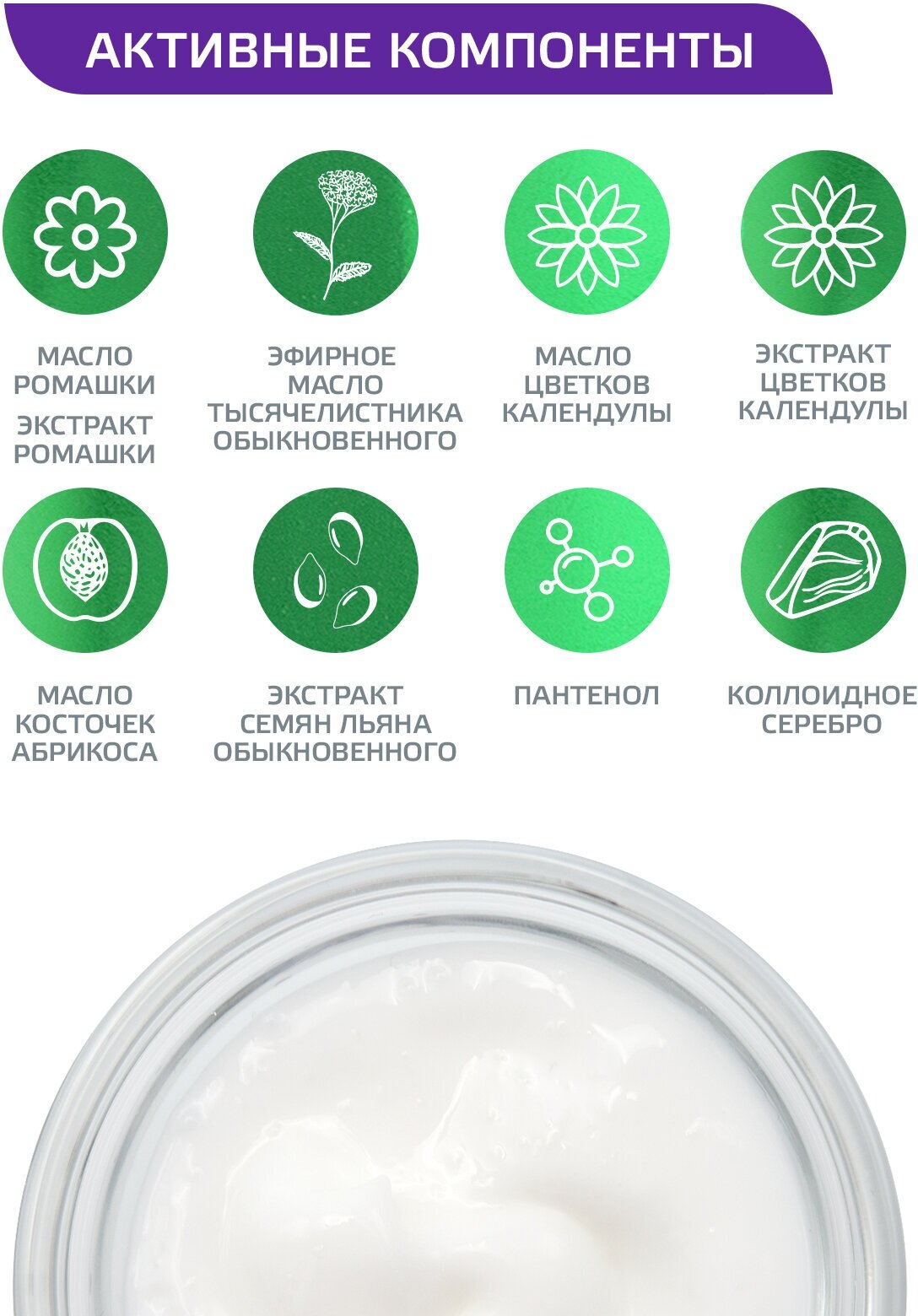 | Активные компоненты | Коллоидное серебро, масло ромашки, тысячелистника, календулы, абрикоса, пантенол, высокомолекулярная гиалуроновая кислота, натуральный ментол, экстракт семени льна, лецитин |
