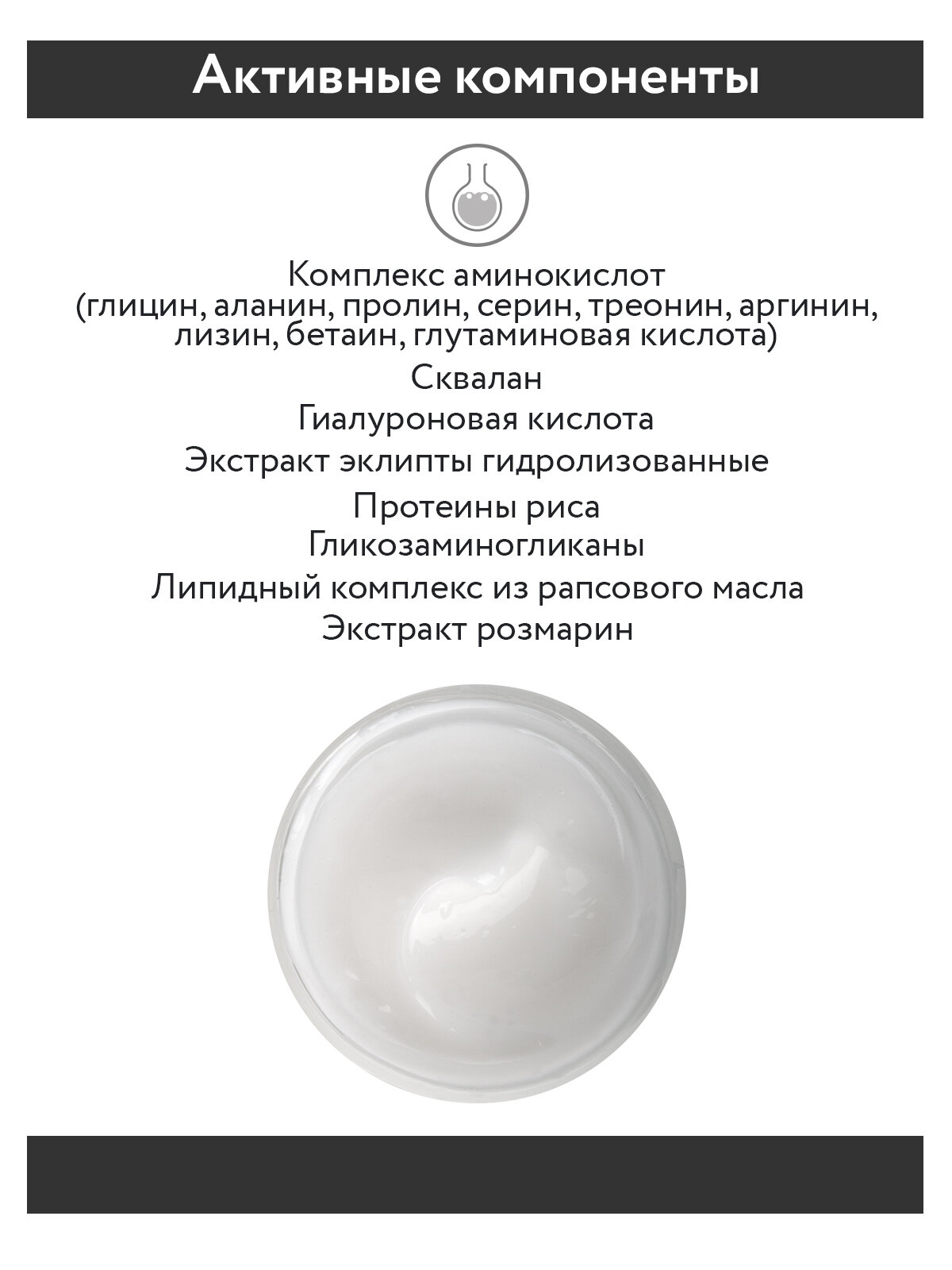 | Активные компоненты | Биоактивный состав: комплекс аминокислот (глицин, аланин, пролин, серин, треонин, аргинин, лизин, бетаин, глутаминовая кислота), сквалан, гиалуроновая кислота, экстракт эклипты гидролизованные протеины риса, глюкозаминогликаны, липидный комплекс из рапсового масла, экстракт розмарина. |