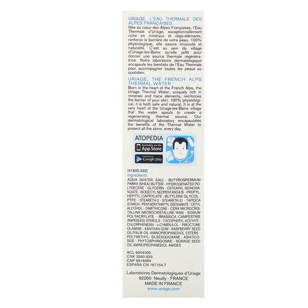 | Состав | eau thermale uriage, aqua, butyrospermum parkii (shea butter), hydrogenated polydecene, glycerin, cetearyl isononanoate, isodecyl neopentanoate, propylheptyl caprylate, butylene glycol, ptfe, steareth-2, steareth-21, tapioca starch polymethylsilsesquioxane, pentaerythrityl distearate, cetyl alcohol, dimethicone, cera microcristallina (microcrystalline wax), sodium polyacrylate, brassica campestris (rapeseed) sterols, tocopheryl acetate, chlorphenesin, raspberry seed oil/palm oil aminopropanediol esters, piroctone olamine, xanthan gum, o-cymen-5-ol |