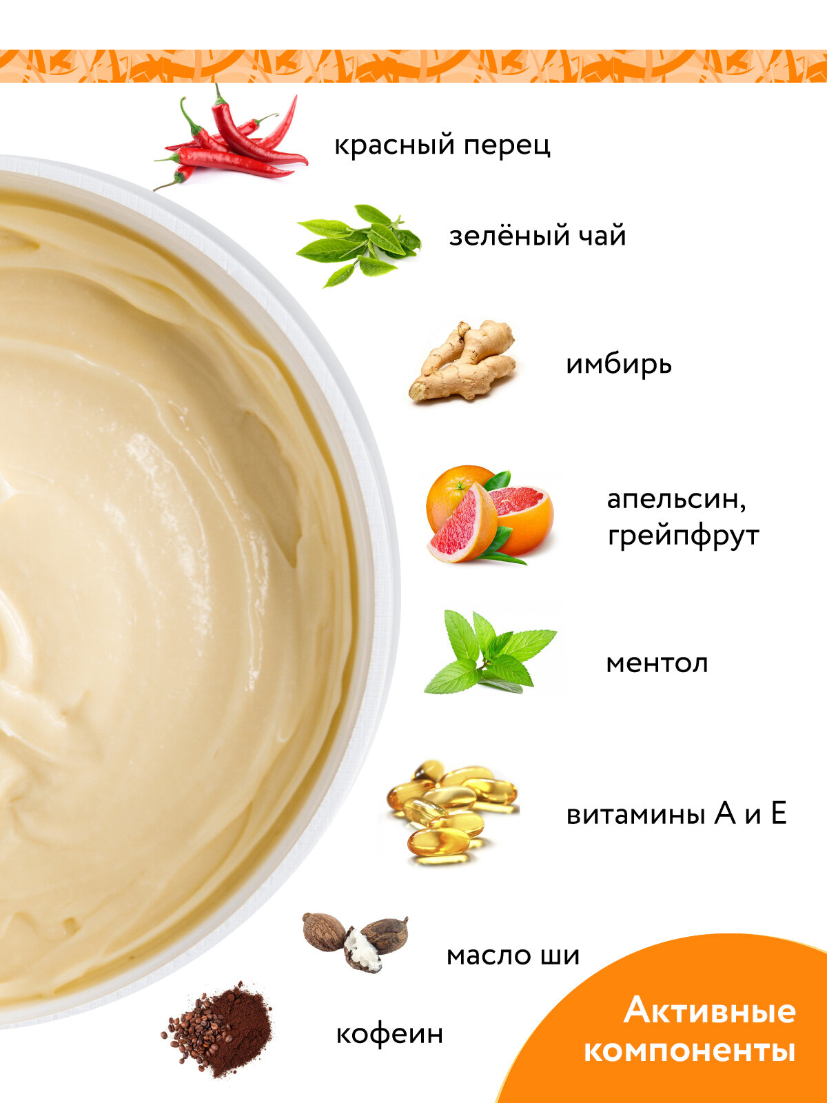 | Активный ингредиент | красный перец, зелёный чай, имбирь, апельсин, грейпфрут, витамины А и Е, масло ши |