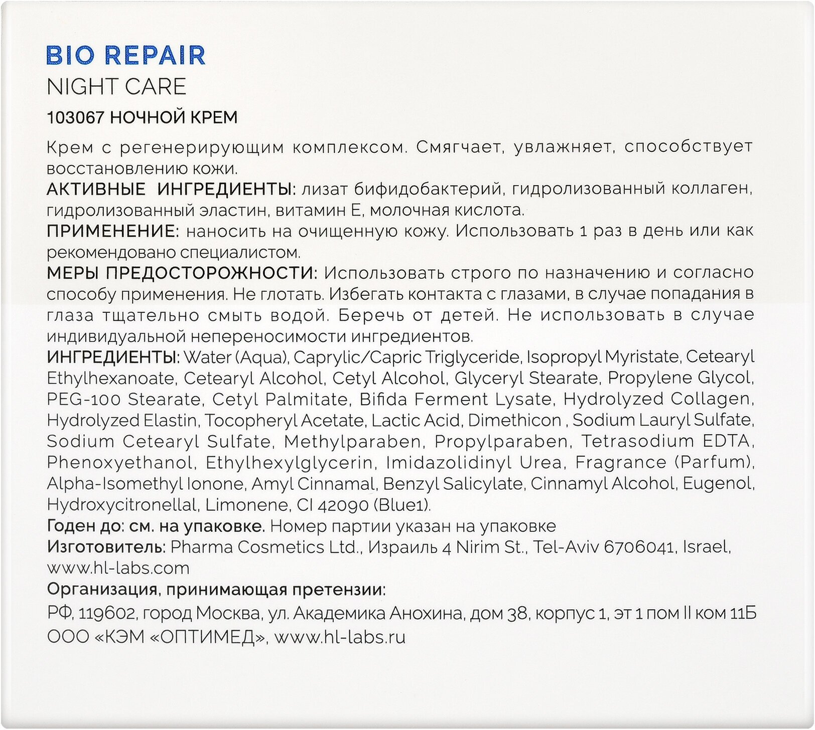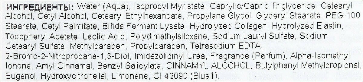 Состав: water (aqua), isopropyl myristate, caprylic/capric triglyceride, cetearyl alcohol, cetyl alcohol, cetearyl ethylhexanoate, propylene glycol, glyceryl stearate, peg-100 stearate, cetyl palmitate, bifida ferment lysate, hydrolyzed collagen, hydrolyzed elastin, tocopheryl acetate, lactic acid, polydimethylsiloxane, sodium sulfate, sodium cetearyl sulfate, methylparaben, imidazolidinyl urea, fragrance (parfum), alpha isomethyl ionone, amyl cinnamal, benzyl salicylate, butylphenyl methylpropional, eugenol, hydroxycitronellal, hydroxyisohexyl 3-cyclohexene carboxaldehyde, limonene, blue 1 (ci 42090). Propylparaben, tetrasodium edta, 2-bromo-2-nitropropan-1,3-diol