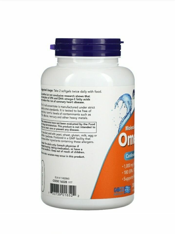 | Полное описание | Концентрат натурального рыбьего жира, используемый в этих мягких капсулах, произведен с соблюдением строгих стандартов качества. Согласно проведенным тестам, продукт не содержит потенциально опасных уровней загрязняющих веществ (например, ртути, тяжелых металлов, PBC, диоксинов и других загрязнителей). • Очистка на молекулярном уровне • Поддерживает состояние сердечно-сосудистой системы • 180 эйкозапентаеновой / 120 докозагексановой кислоты • Поддерживает здоровье сердца • Не содержит ГМО • Биологически активная добавка • Кошерный продукт с желатином • Омега-3 и рыбий жир • Семейное предприятие, основанное в 1968 году • Соответствует стандарту качества GMP |