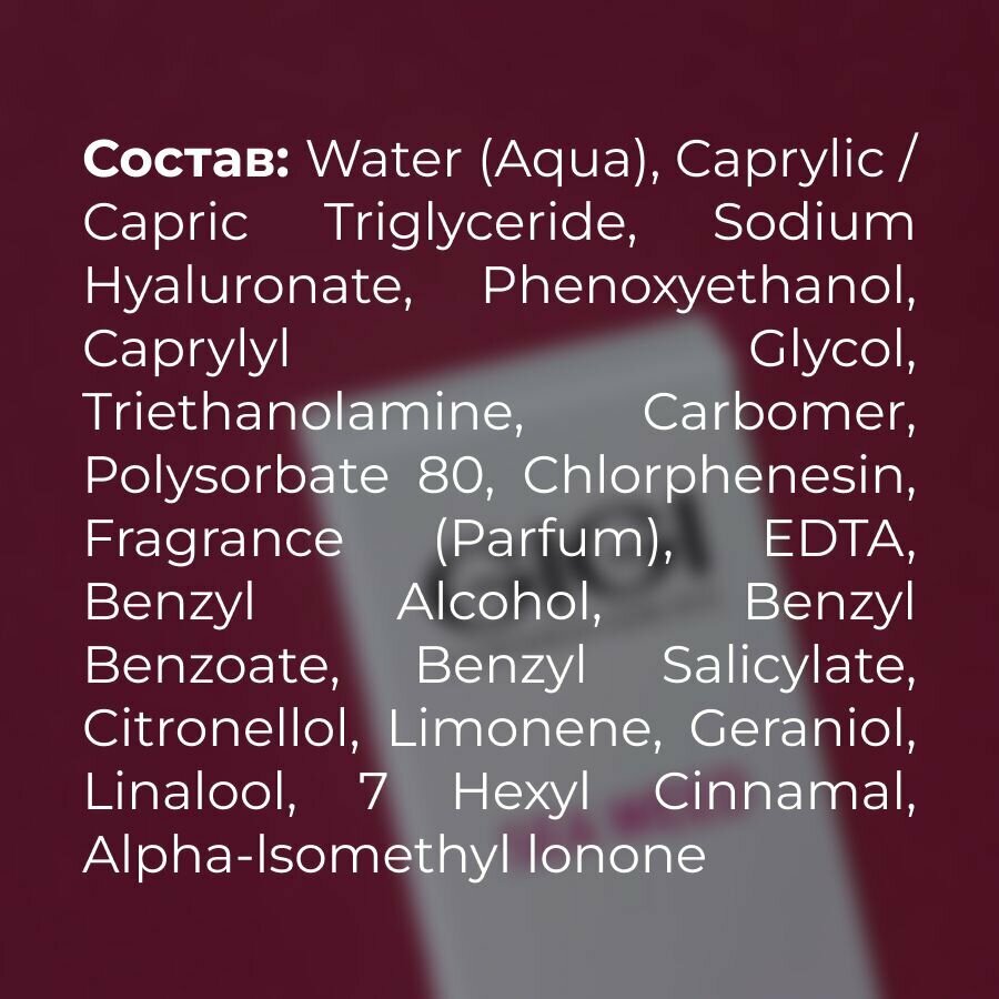 | Состав | water (aqua), caprylic/capric triglyceride, algae extract, phenoxyethanol & methylparaben & ethylparaben & butylparaben & propylparaben & isobutylparaben, carbomer, polysorbate 20, sodium hyaluronate, fragrance (parfum), sorbitan olivate, sodium hydroxide, 2-bromo-2-nitropropane-1,3-diol |