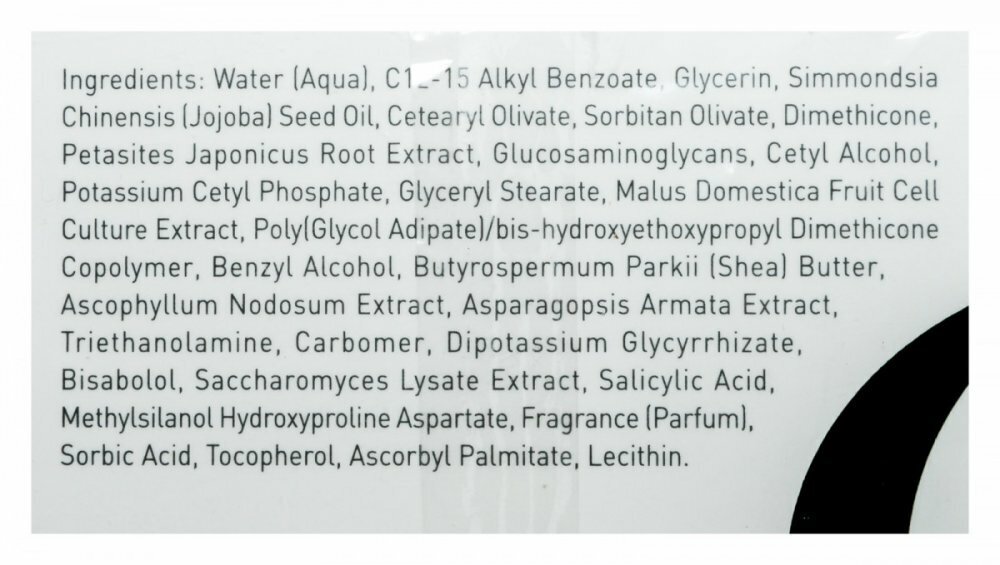 | Состав | water (aqua), glycerin, simmondsia chinensis (jojoba) seed oil, cetearyl olivate, sorbitan olivate, dicaprylyl ether, dimethicone, c12-15 alkyl benzoate, petasites japonicus root extract, glycosaminoglycans, cetyl alcohol, potassium cetyl phosphate, glyceryl stearate, malus domestica fruit cell culture extract, polyglycol adipate)/bis-hydroxyethoxypropyl dimethicone copolymer, phenoxyethanol, butyrospermum parkii (shea butter), ascophyllum nodosum extract & asparagopsis armata extract, carbomer, dipotassium glycyrrhizate, caprylyl glycol, bisabolol, saccharomyces lysate extract, chlorphenesin, methylsilanol hydroxyproline aspartate, fragrance (parfum), tocopherol, ascorbyl palmitate, lecithin |