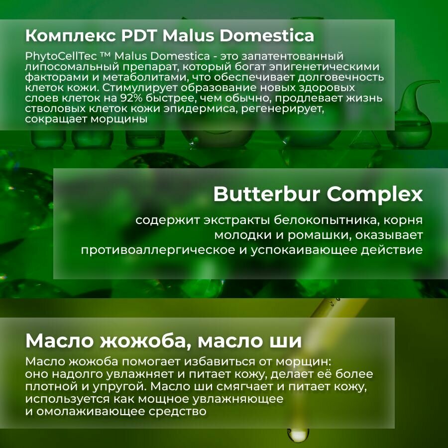 - экстракт стволовых клеток яблок -поддерживает систему кровообращения и укрепляет стенки сосудов, обеспечивает увлажнение и питание кожи, защиту от вредного воздействия окружающей среды, обладает противовоспалительным действием