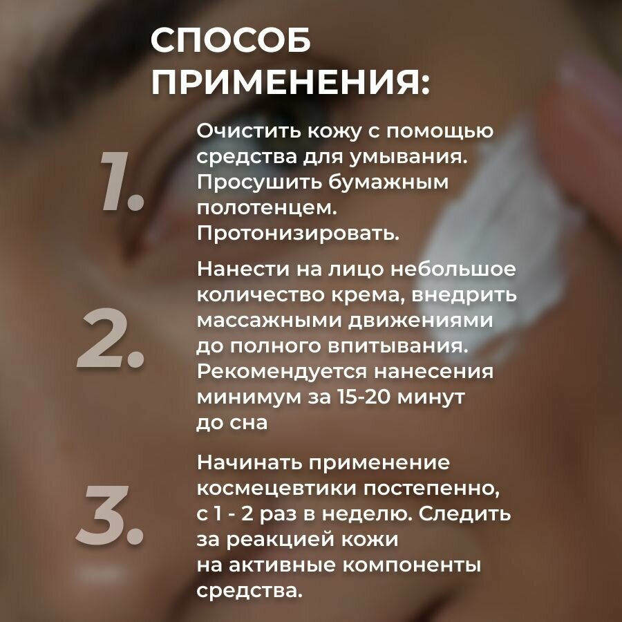 Ночной питательный крем содержит комплекс эпигенетических компонентов, ответственных за пролиферацию эпителия: Содержит большой процент вторичных метаболитов - незаменимых для кожного иммунитета.