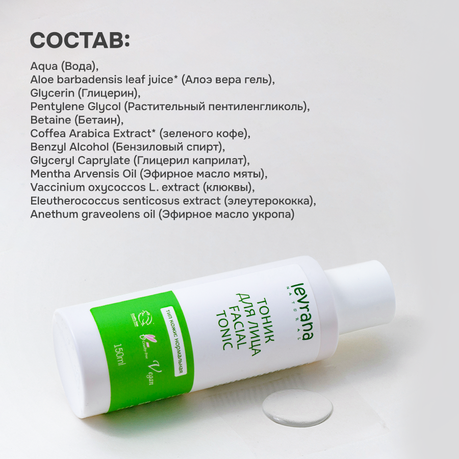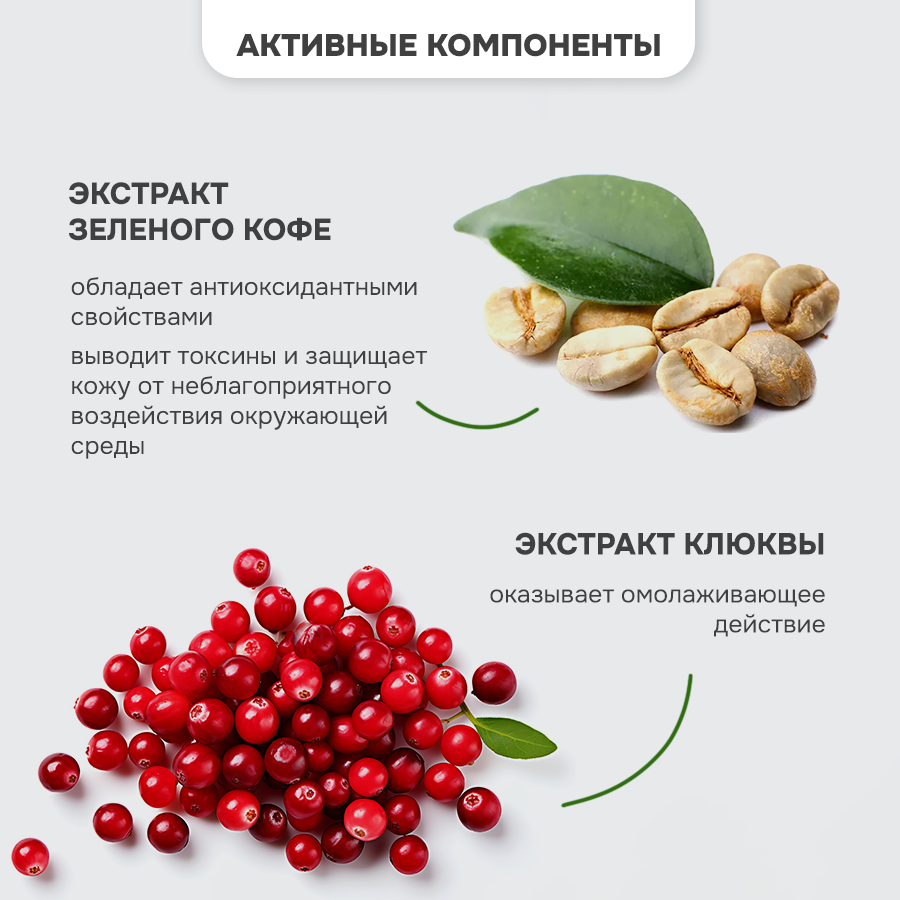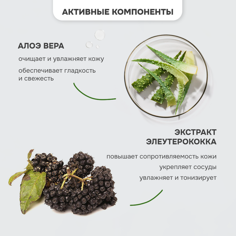 Состав: aqua (вода), aloe barbadensis leaf juice (алоэ вера гель), glycerin (глицерин), pentylene glycol (растительный пентиленгликоль), betaine (бетаин), coffea arabica extract (экстракт зеленого кофе), benzyl alcohol (бензиловый спирт), glyceryl caprylate (глицерил каприлат), mentha arvensis oil (эфирное масло мяты), vaccinium oxycoccos l. extract (экстракт клюквы), eleutherococcus senticosus extract (экстракт элеутерококка), anethum graveolens oil (эфирное масло укропа)